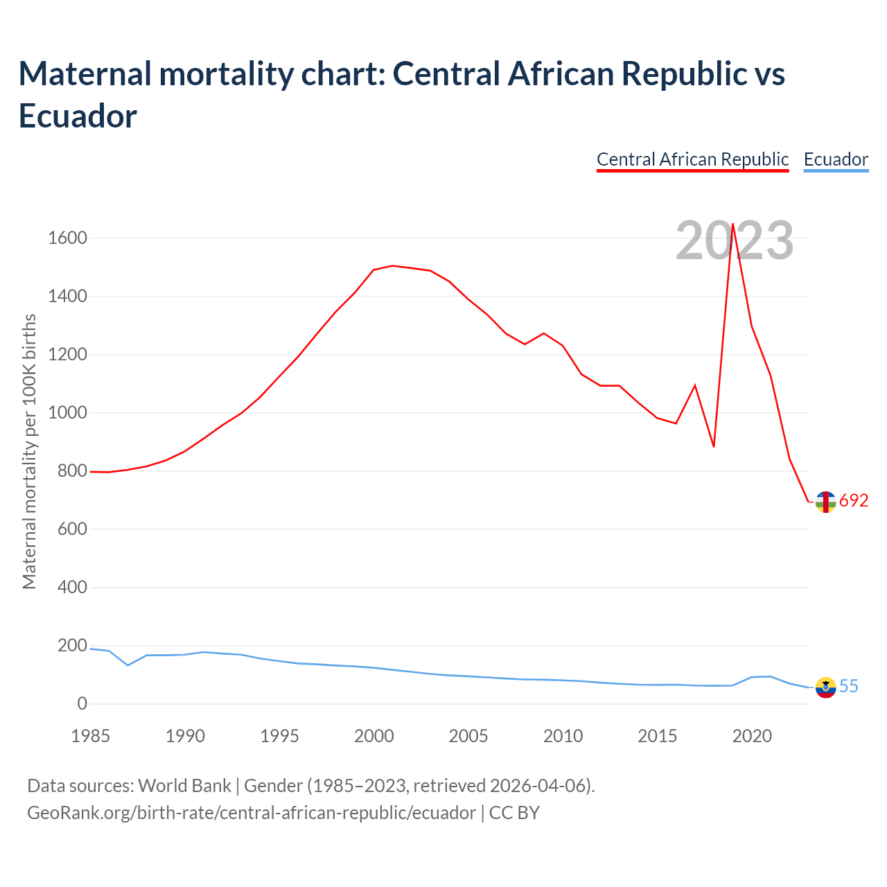 The maternal mortality rate, which is the probability of dying during childbirth or within 42 days of pregnancy termination, is 692 deaths per 100,000 live births in the Central African Republic, compared to 55 deaths in Ecuador.