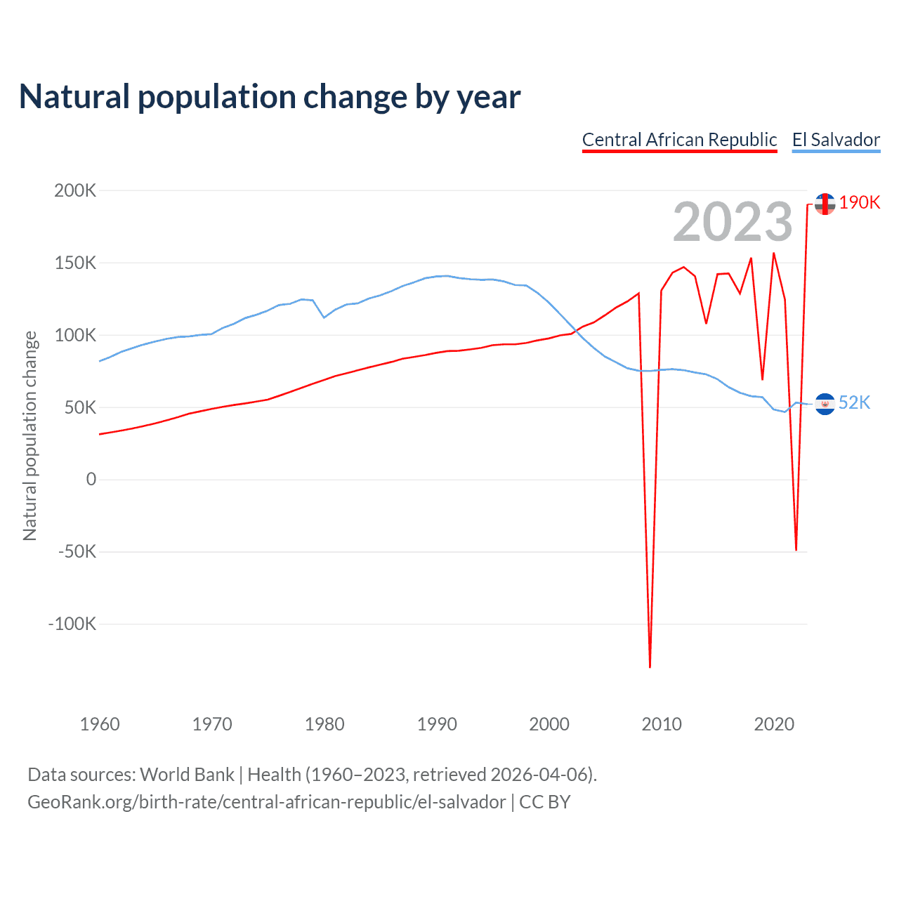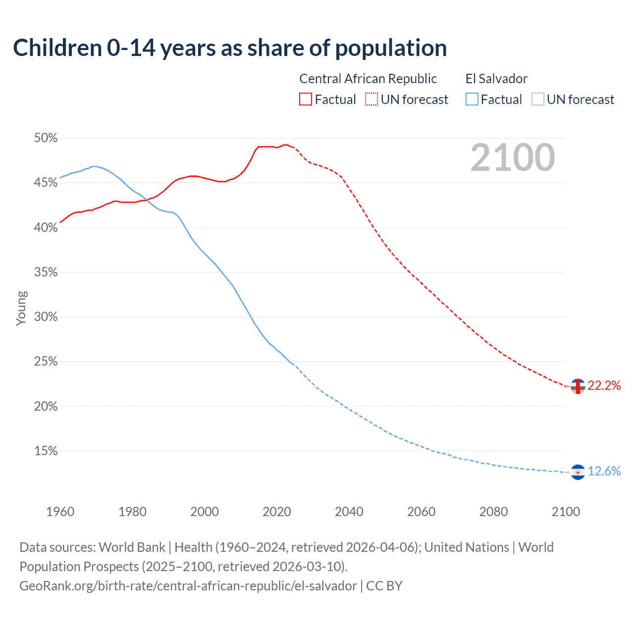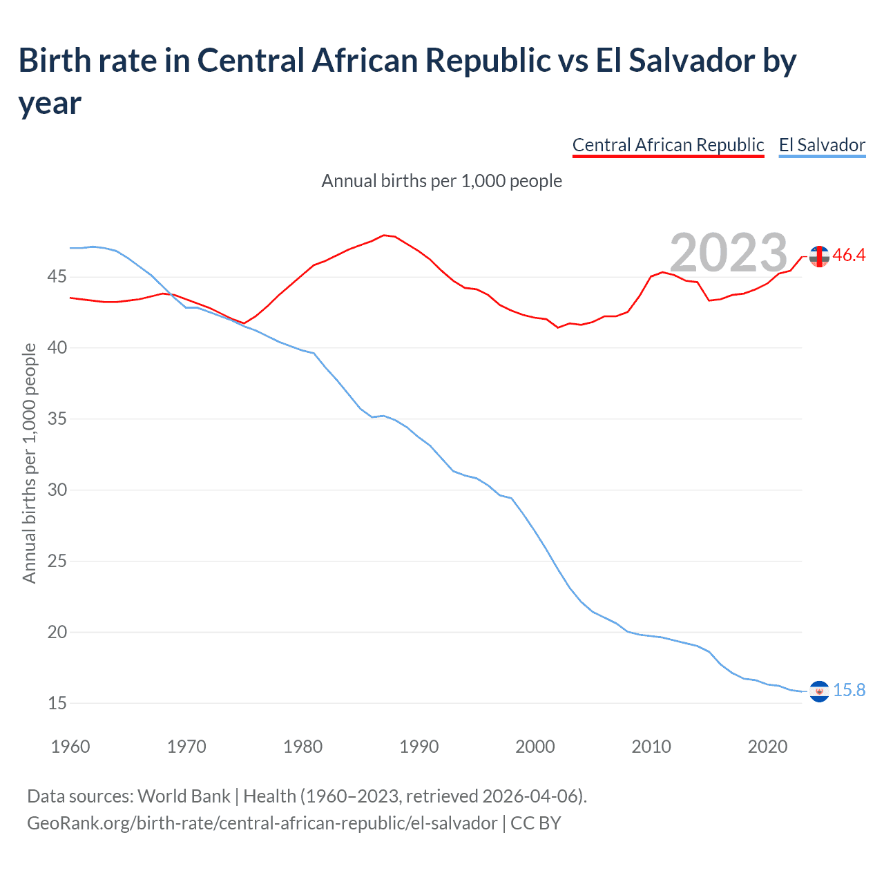 According to the latest available data on birth rates, the fertility rate in the Central African Republic was 6.01 children per woman in 2023, compared to 1.78 in El Salvador in 2023. The replacement level is considered to be 2.1 children per woman.