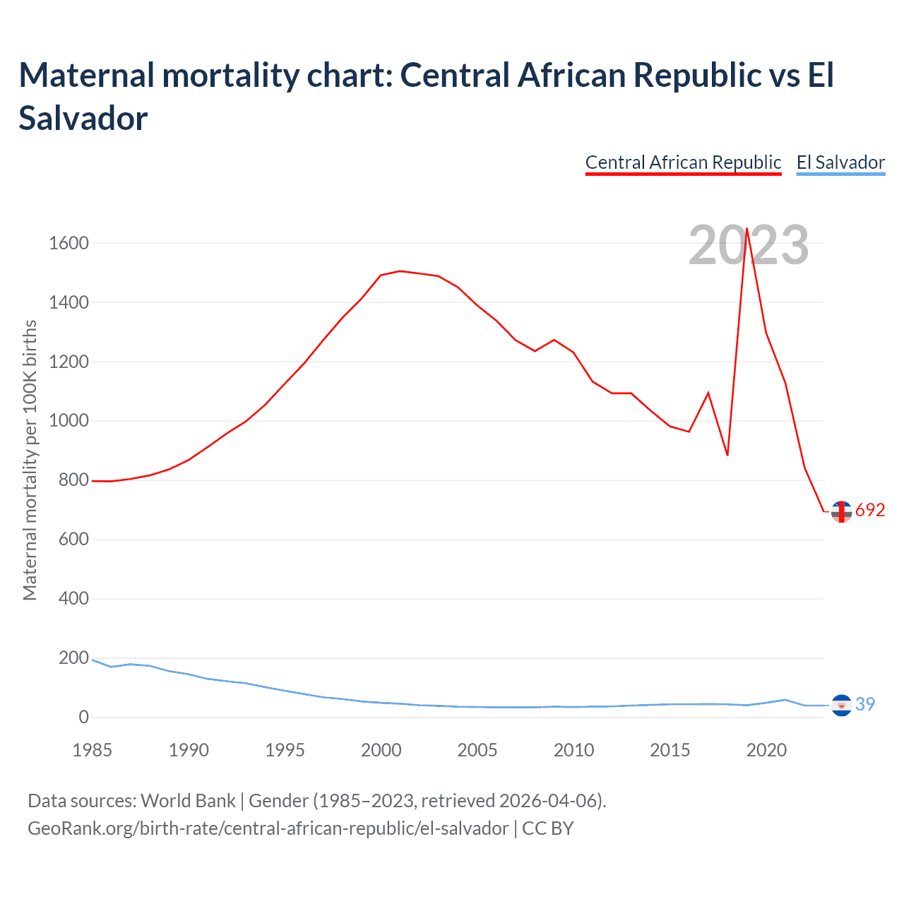 The maternal mortality rate, which is the probability of dying during childbirth or within 42 days of pregnancy termination, is 692 deaths per 100,000 live births in the Central African Republic, compared to 39 deaths in El Salvador.