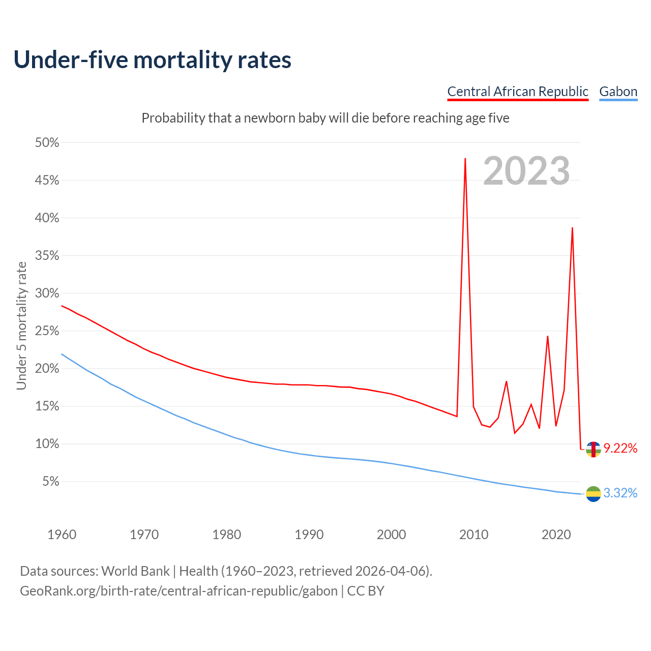 The chance that a newborn baby will die before reaching age five is 9.22% in the Central African Republic and 3.32% in Gabon. Above is a chart with historical data on under-five mortality rates.