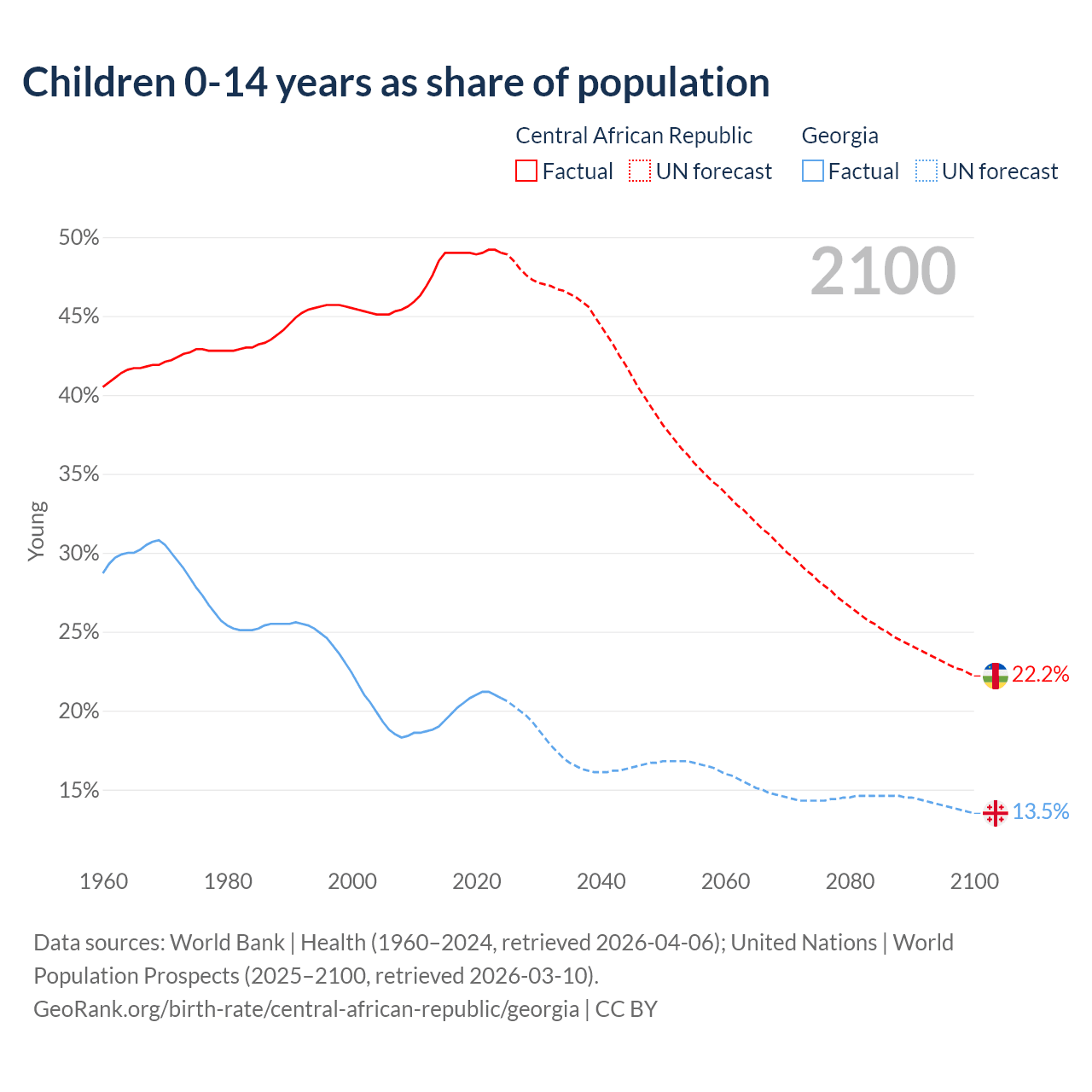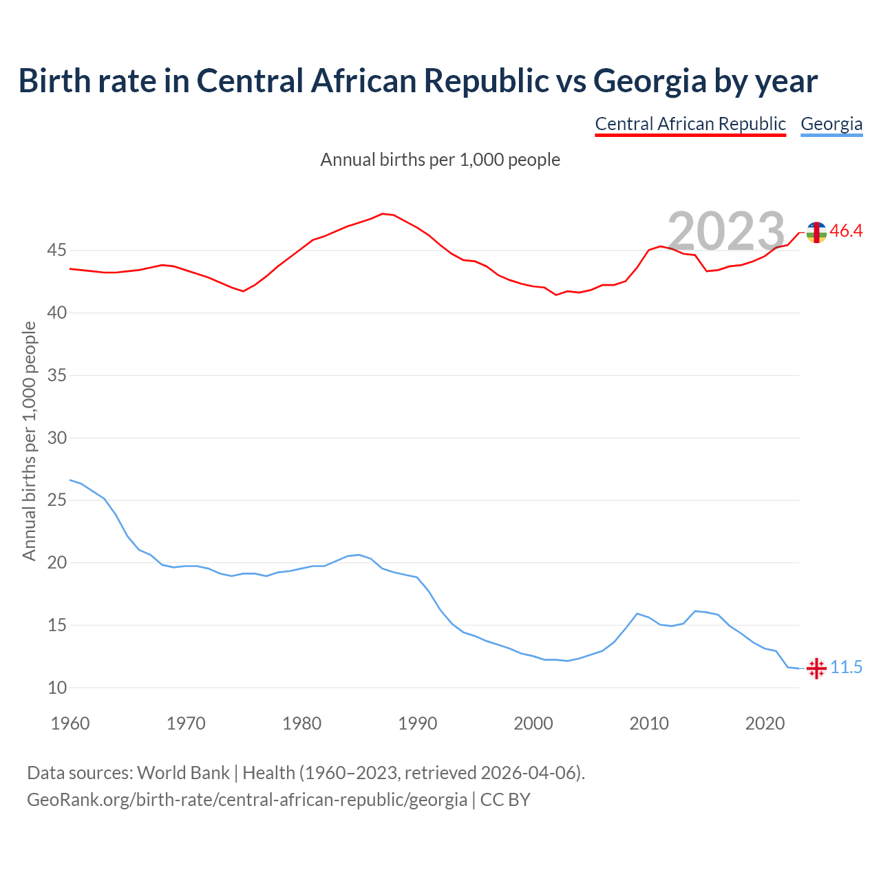 The Central African Republic has an annual birth rate of 46.4 births per 1,000 people, compared to 11.5 for Georgia. The average number of children a woman is expected to have during her lifetime — the fertility rate, is 6.01 in the Central African Republic and 1.81 in Georgia — 69.9% difference.
