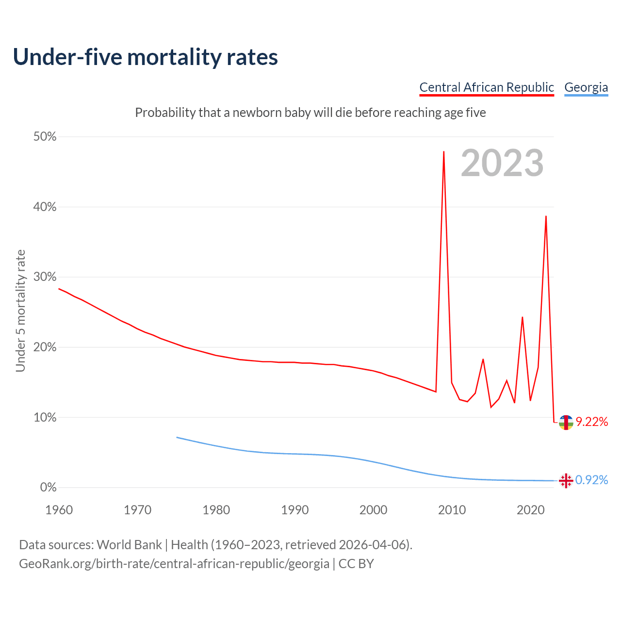 The chance that a newborn baby will die before reaching age five is 9.22% in the Central African Republic and 0.92% in Georgia. Above is a chart with historical data on under-five mortality rates.