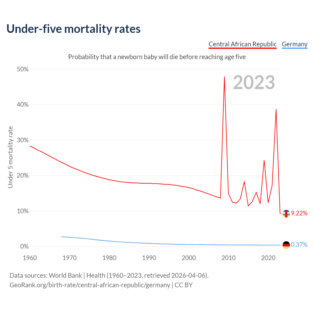 The chance that a newborn baby will die before reaching age five is 9.22% in the Central African Republic and 0.37% in Germany. Above is a chart with historical data on under-five mortality rates.