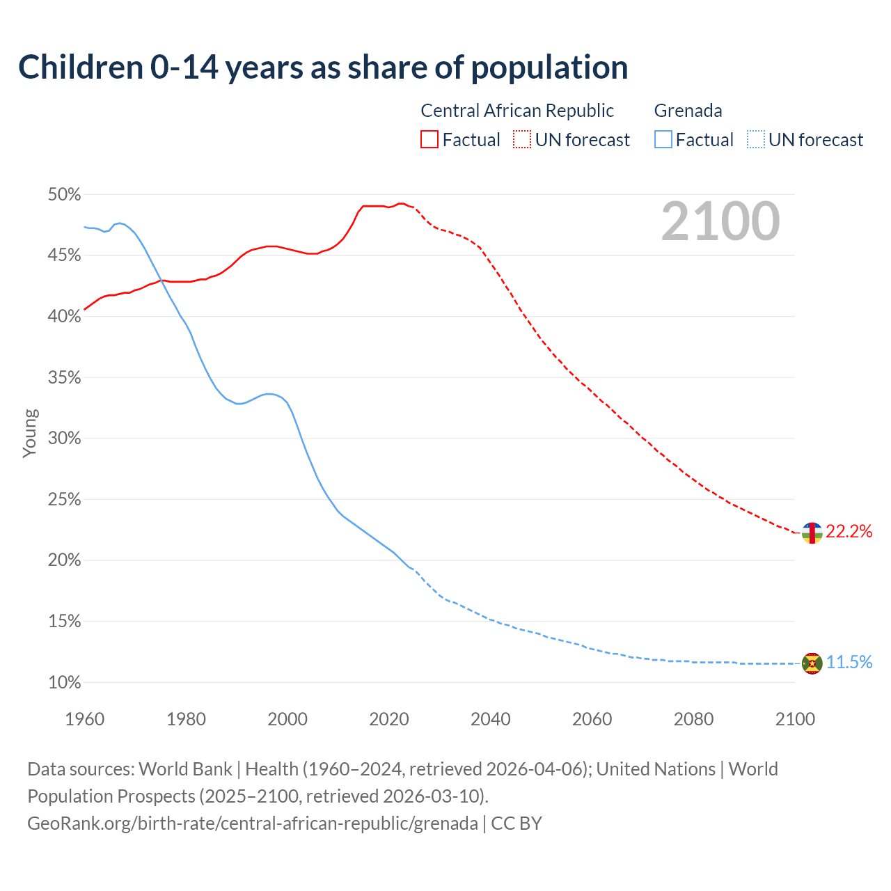 According to the latest available data on birth rates, the fertility rate in the Central African Republic was 6.01 children per woman in 2023, compared to 1.49 in Grenada in 2023. The replacement level is considered to be 2.1 children per woman.