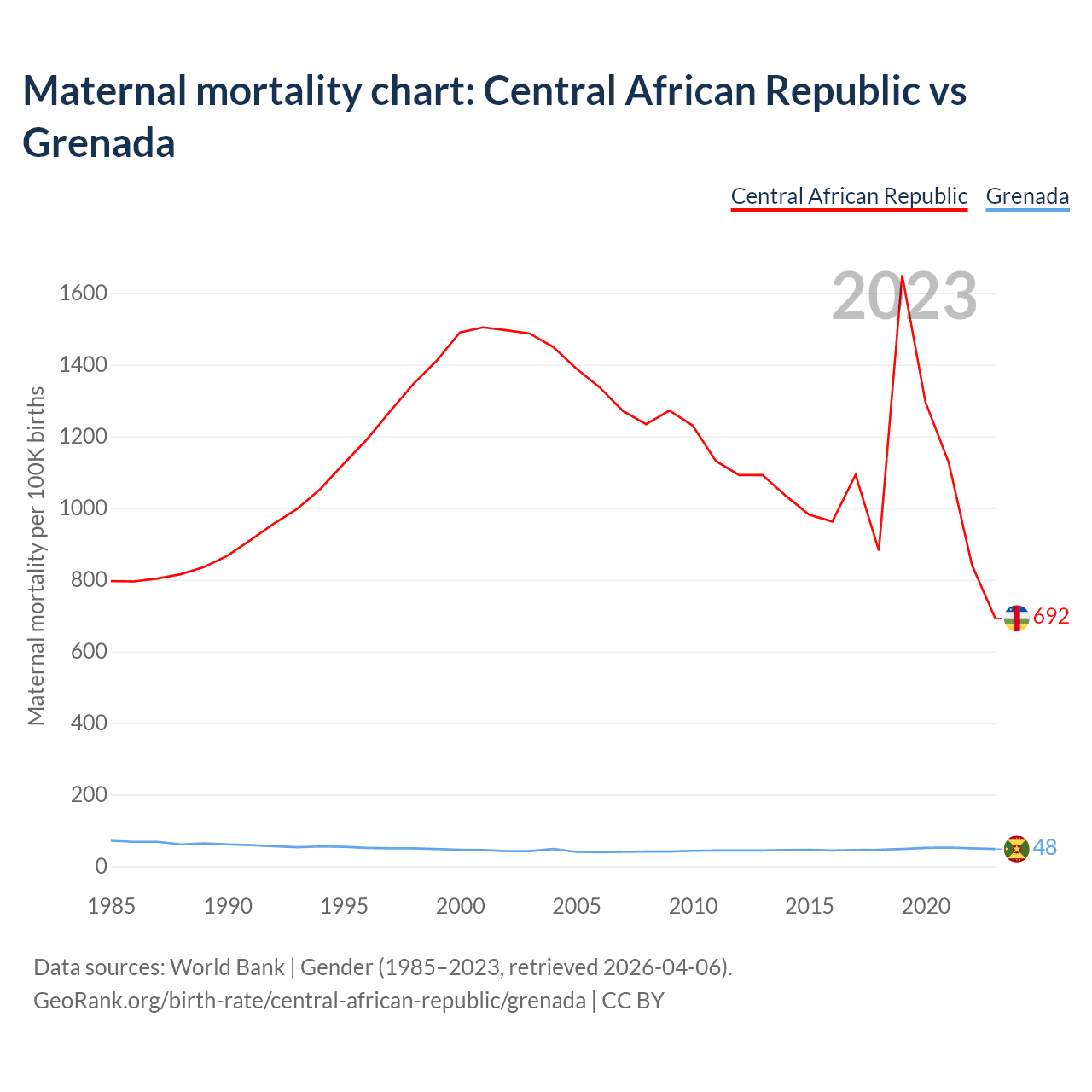 The maternal mortality rate, which is the probability of dying during childbirth or within 42 days of pregnancy termination, is 692 deaths per 100,000 live births in the Central African Republic, compared to 48 deaths in Grenada.