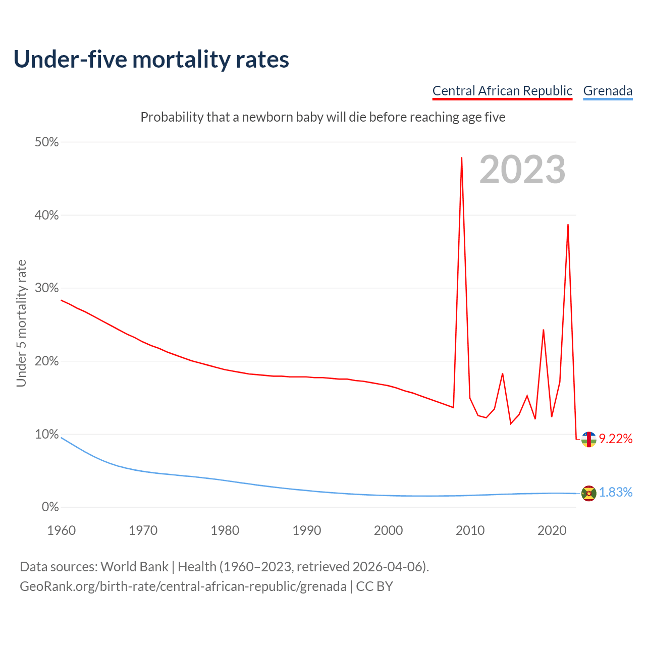 The chance that a newborn baby will die before reaching age five is 9.22% in the Central African Republic and 1.83% in Grenada. Above is a chart with historical data on under-five mortality rates.
