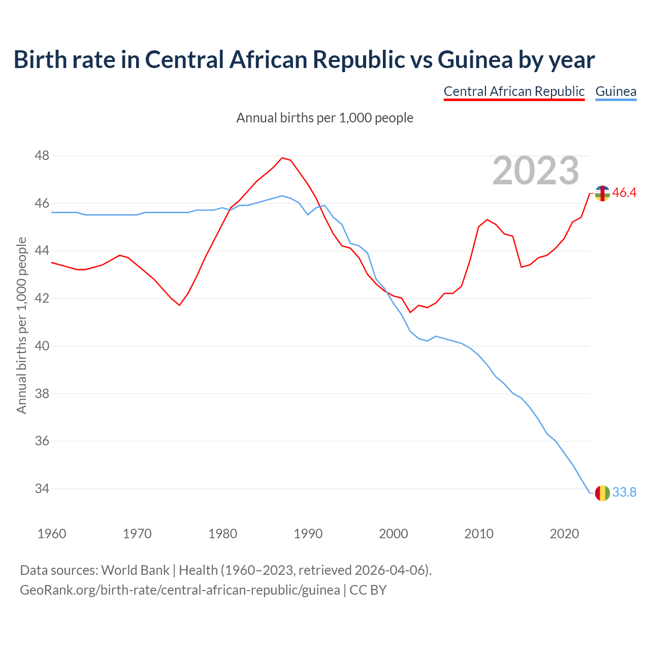 The Central African Republic has an annual birth rate of 46.4 births per 1,000 people, compared to 33.8 for Guinea. The average number of children a woman is expected to have during her lifetime — the fertility rate, is 6.01 in the Central African Republic and 4.22 in Guinea — 29.9% difference.