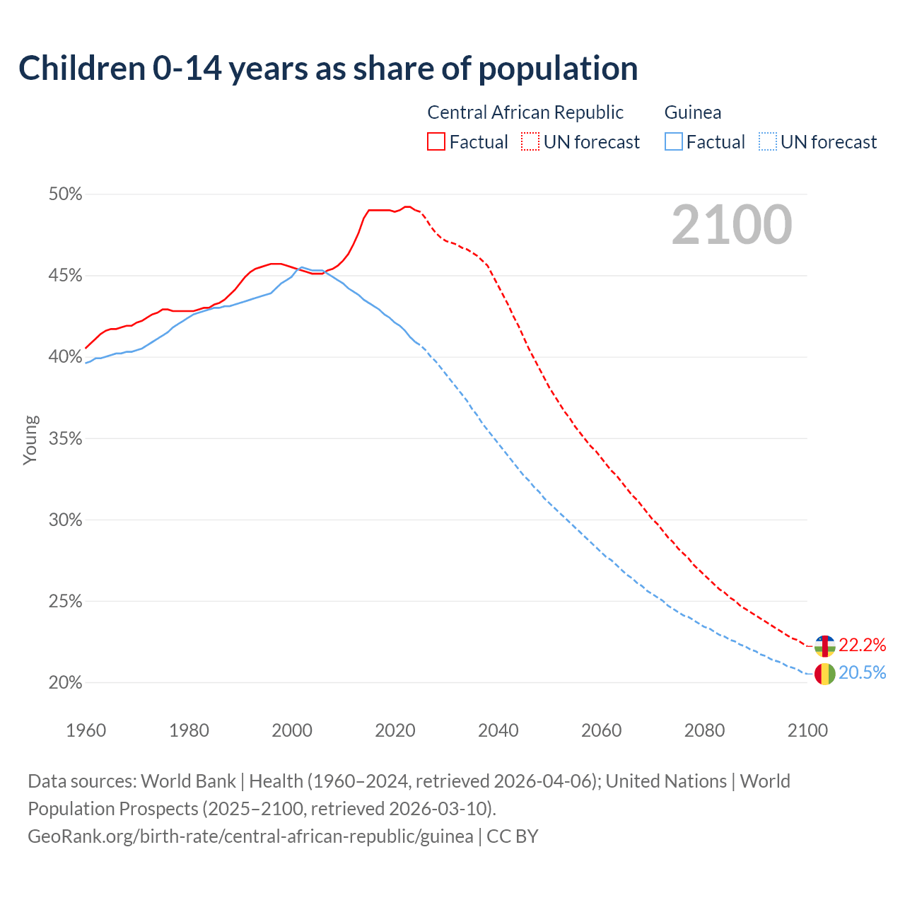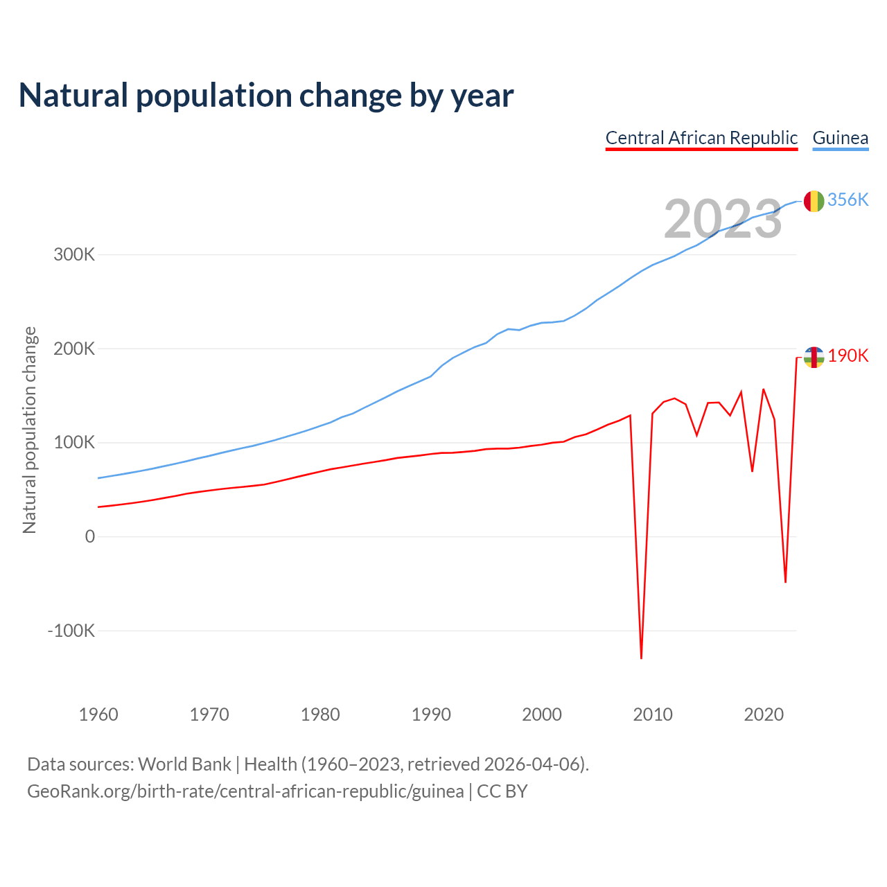 According to the latest available data on birth rates, the fertility rate in the Central African Republic was 6.01 children per woman in 2023, compared to 4.22 in Guinea in 2023. The replacement level is considered to be 2.1 children per woman.