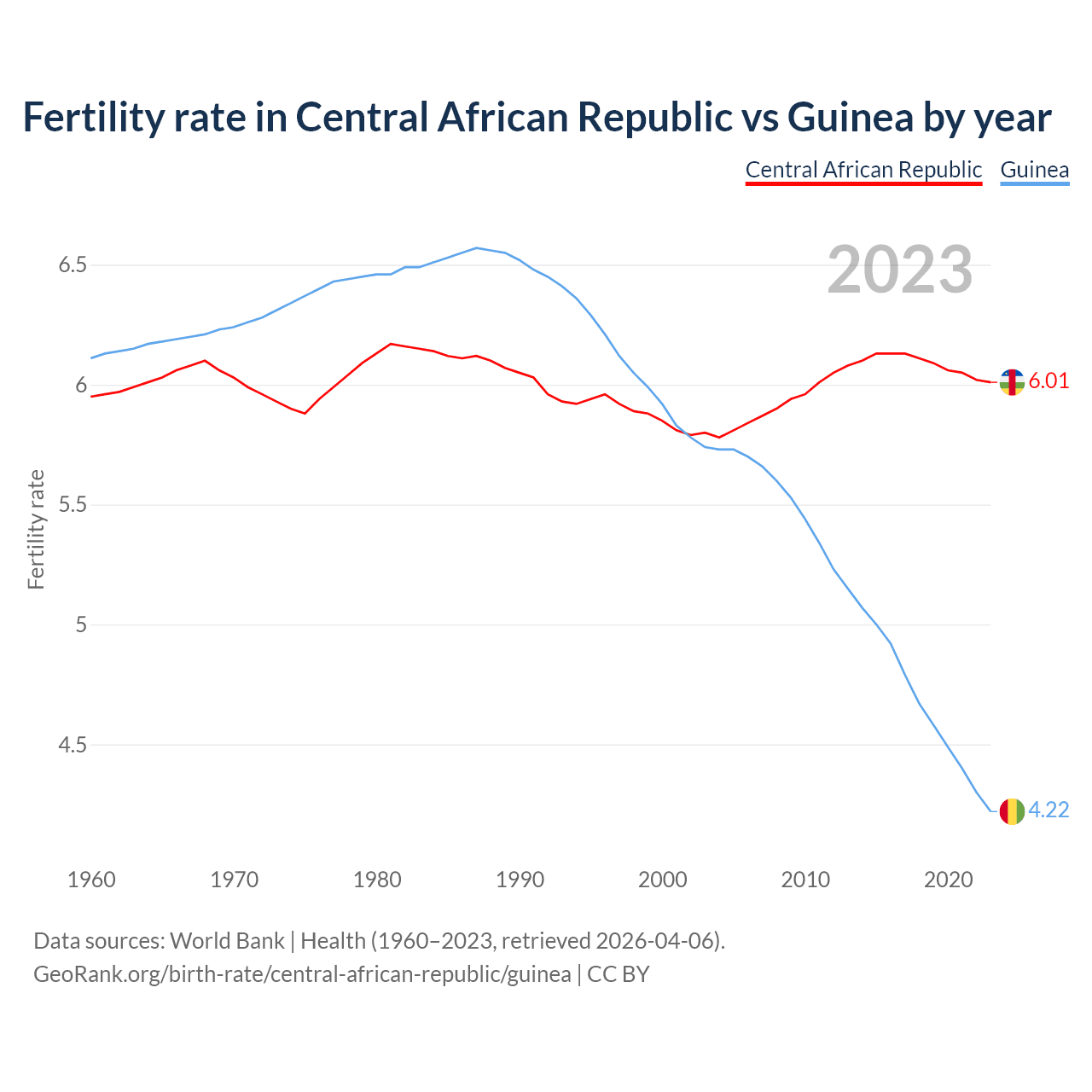 1960 vs 2023, the fertility rate has changed by +1.08% in the Central African Republic and by 31% in Guinea — in 1960, it was 5.95 and 6.11, respectively.
