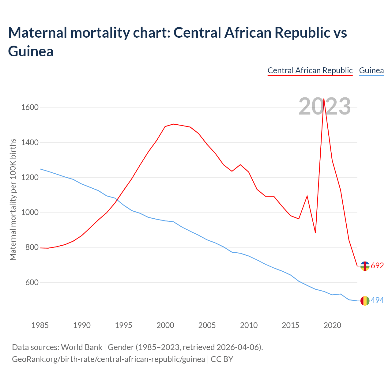 The maternal mortality rate, which is the probability of dying during childbirth or within 42 days of pregnancy termination, is 692 deaths per 100,000 live births in the Central African Republic, compared to 494 deaths in Guinea.