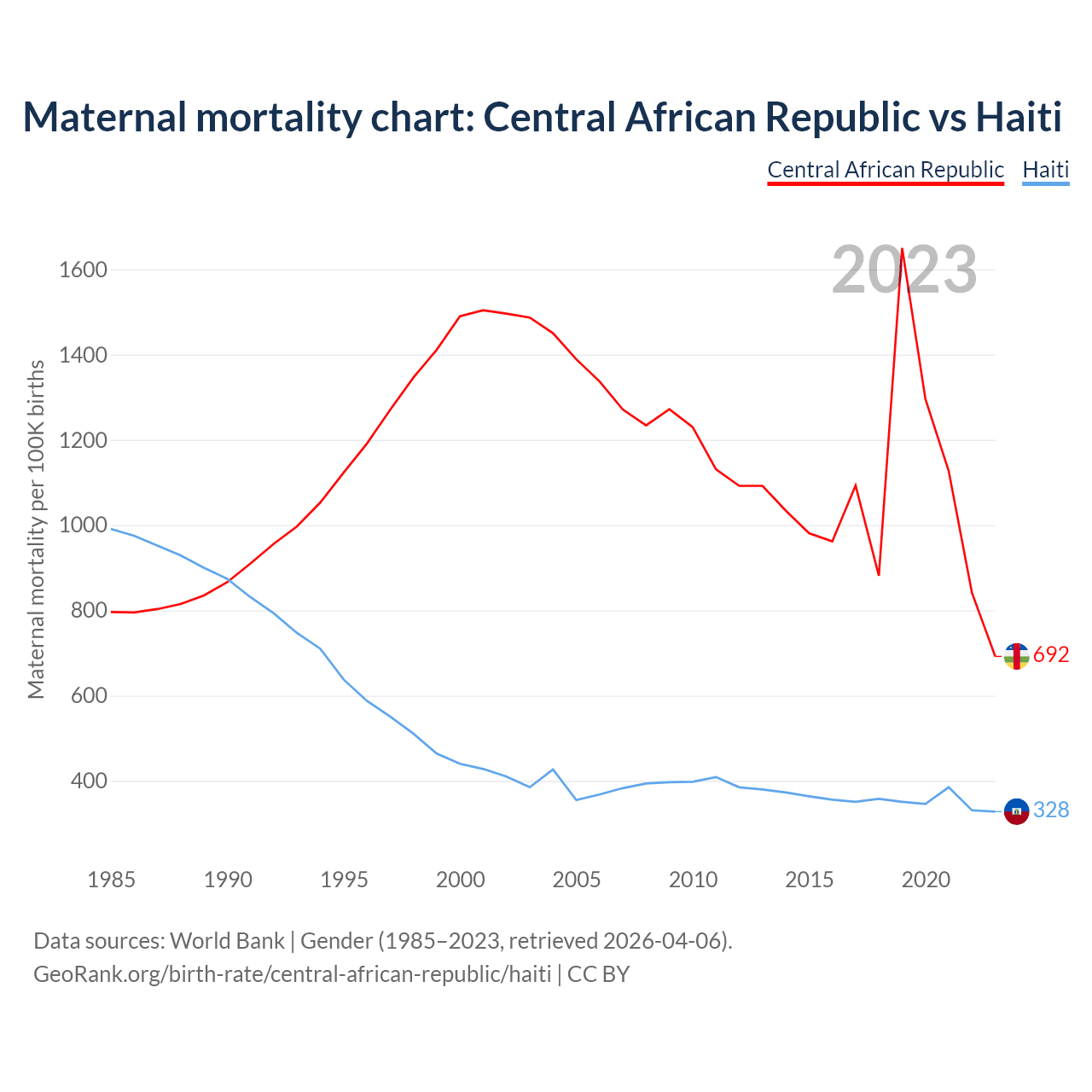 The maternal mortality rate, which is the probability of dying during childbirth or within 42 days of pregnancy termination, is 692 deaths per 100,000 live births in the Central African Republic, compared to 328 deaths in Haiti.
