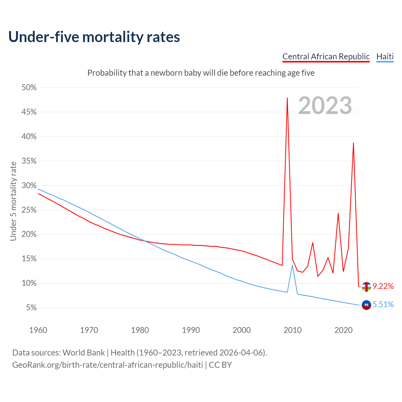The chance that a newborn baby will die before reaching age five is 9.22% in the Central African Republic and 5.51% in Haiti. Above is a chart with historical data on under-five mortality rates.