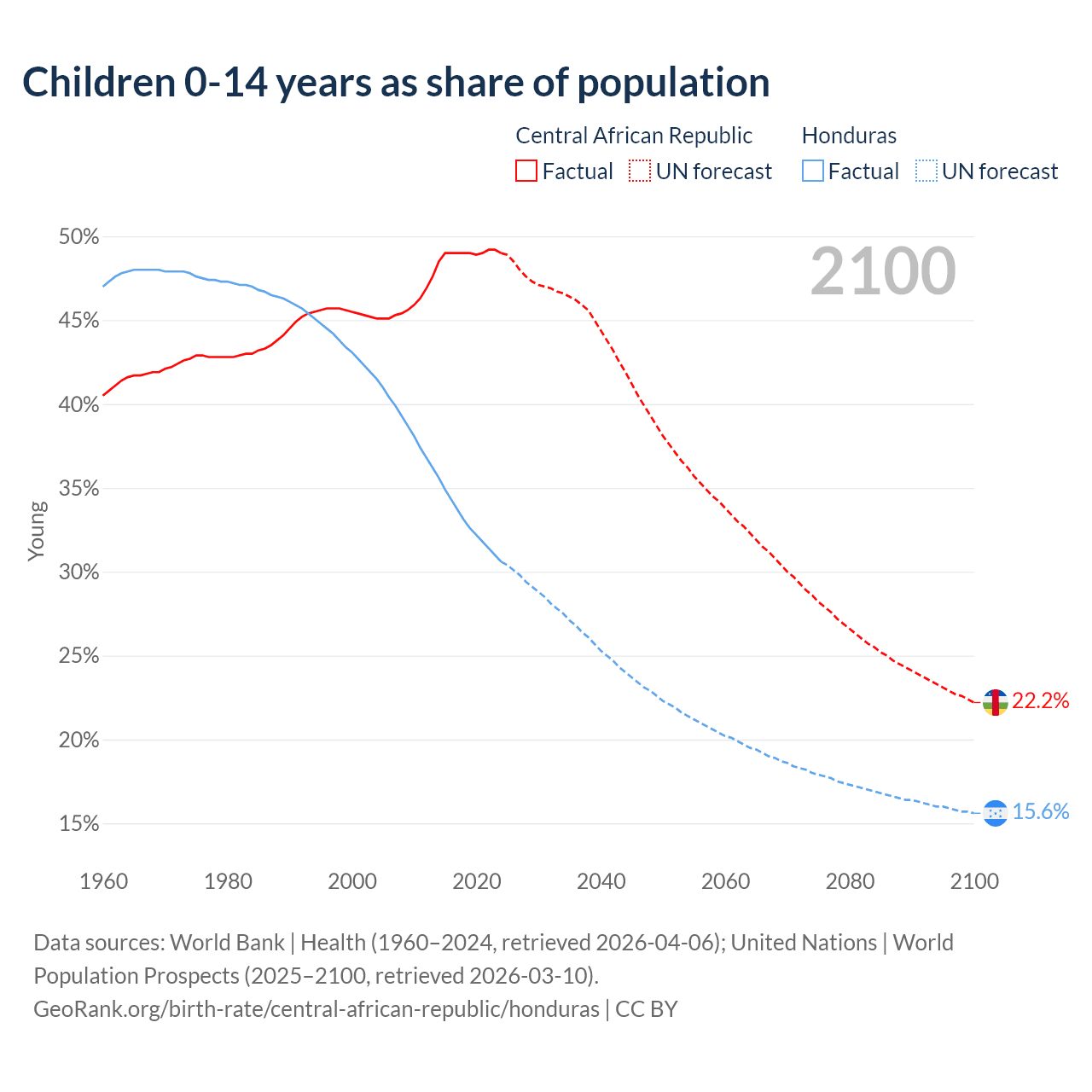 According to the latest available data on birth rates, the fertility rate in the Central African Republic was 6.01 children per woman in 2023, compared to 2.5 in Honduras in 2023. The replacement level is considered to be 2.1 children per woman.