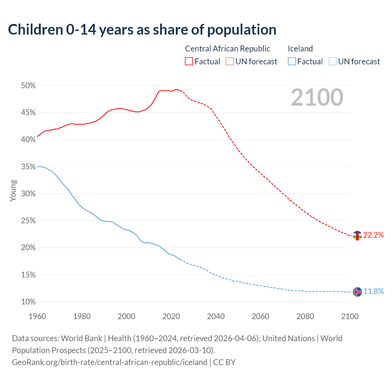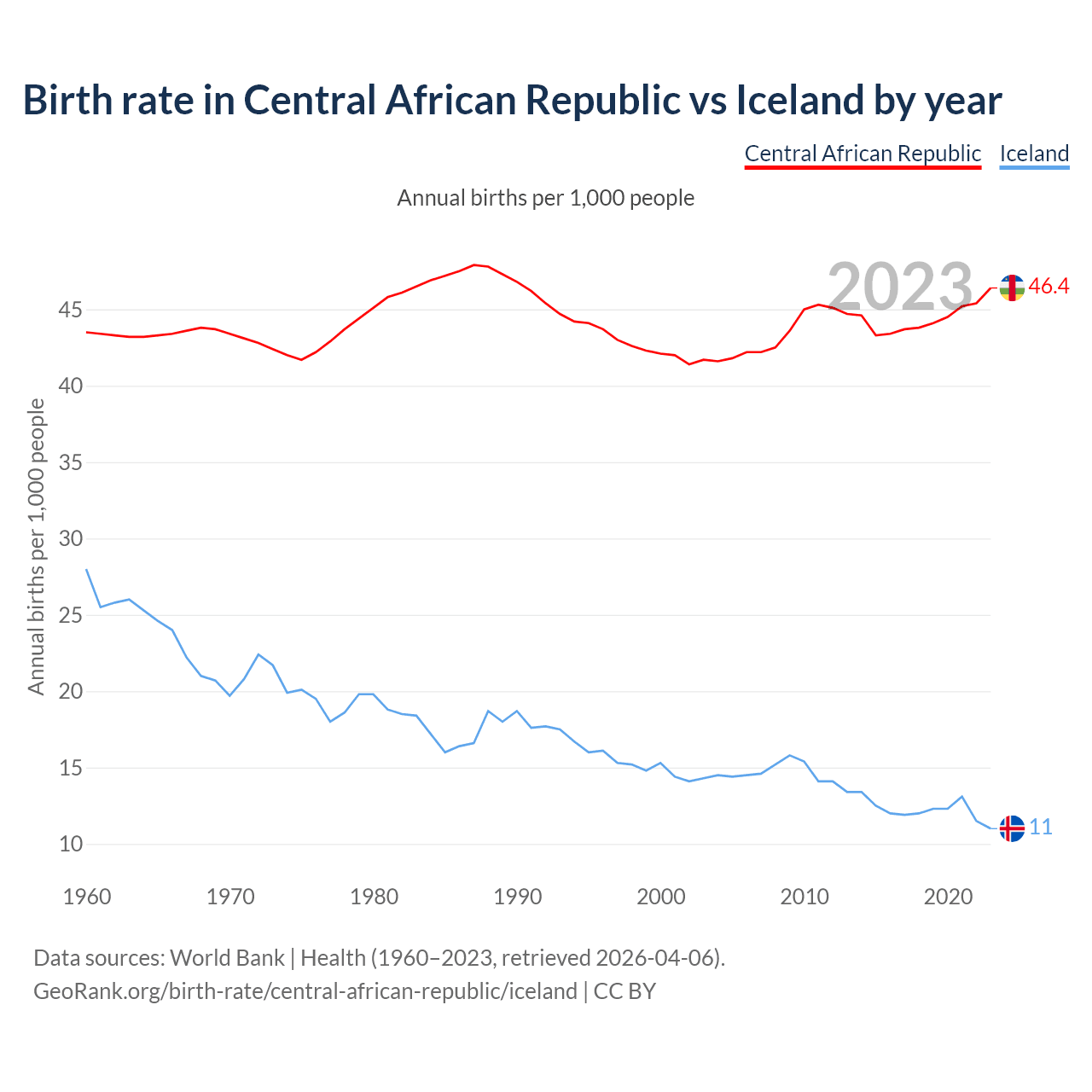 The Central African Republic has an annual birth rate of 46.4 births per 1,000 people, compared to 11 for Iceland. The average number of children a woman is expected to have during her lifetime — the fertility rate, is 6.01 in the Central African Republic and 1.59 in Iceland — 73.6% difference.