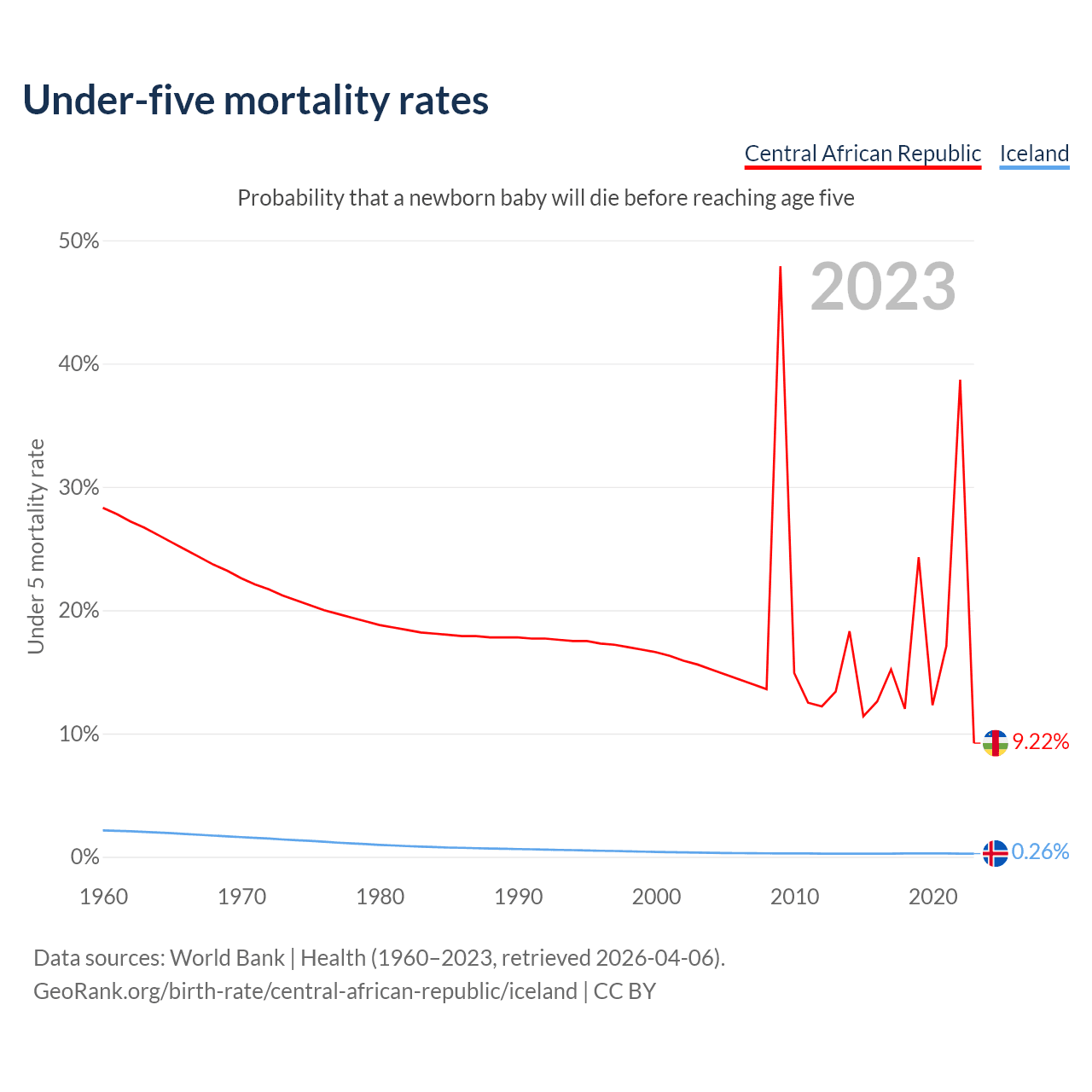 The chance that a newborn baby will die before reaching age five is 9.22% in the Central African Republic and 0.26% in Iceland. Above is a chart with historical data on under-five mortality rates.