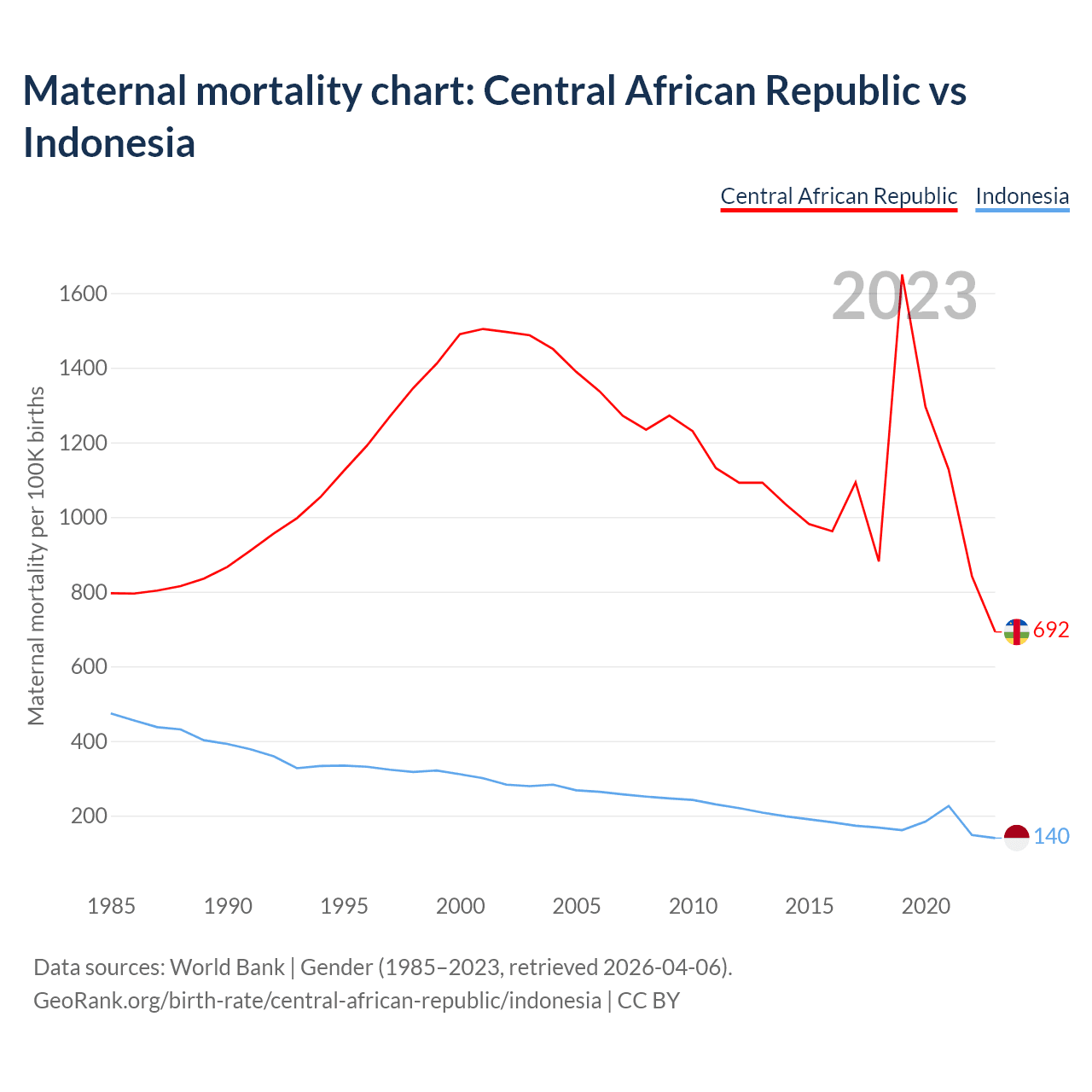 The maternal mortality rate, which is the probability of dying during childbirth or within 42 days of pregnancy termination, is 692 deaths per 100,000 live births in the Central African Republic, compared to 140 deaths in Indonesia.