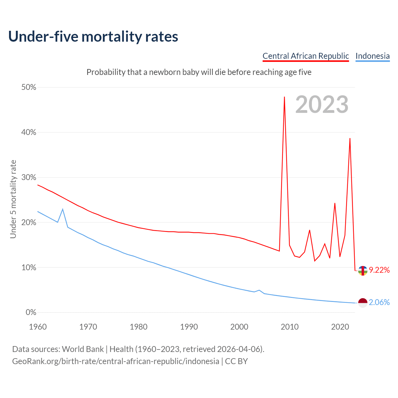 The chance that a newborn baby will die before reaching age five is 9.22% in the Central African Republic and 2.06% in Indonesia. Above is a chart with historical data on under-five mortality rates.