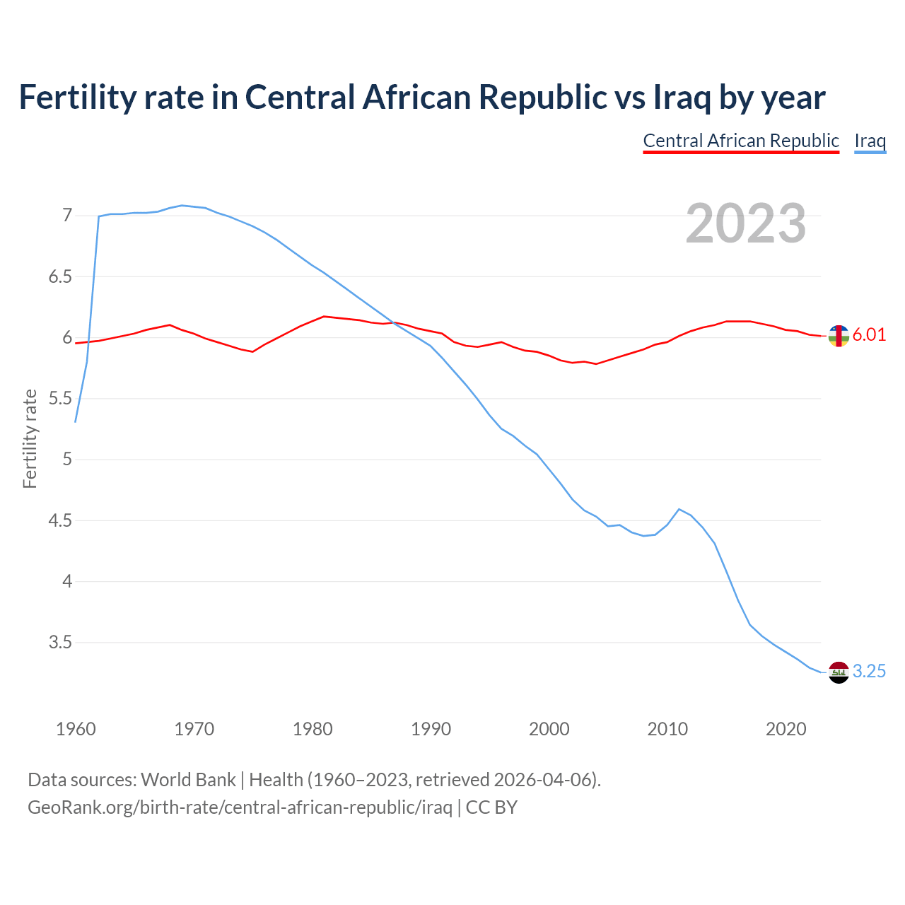 1960 vs 2023, the fertility rate has changed by +1.08% in the Central African Republic and by 38.7% in Iraq — in 1960, it was 5.95 and 5.3, respectively.