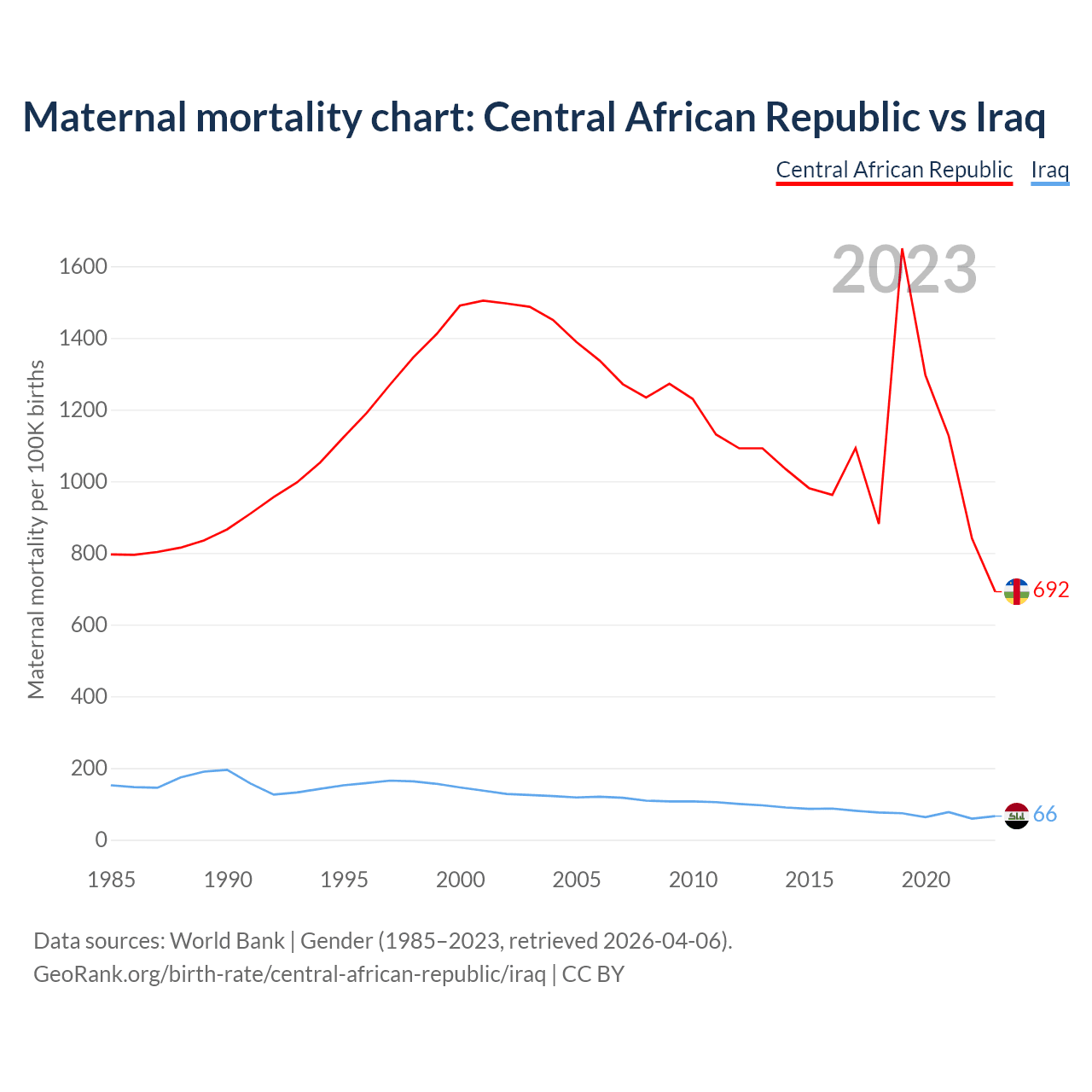 The maternal mortality rate, which is the probability of dying during childbirth or within 42 days of pregnancy termination, is 692 deaths per 100,000 live births in the Central African Republic, compared to 66 deaths in Iraq.