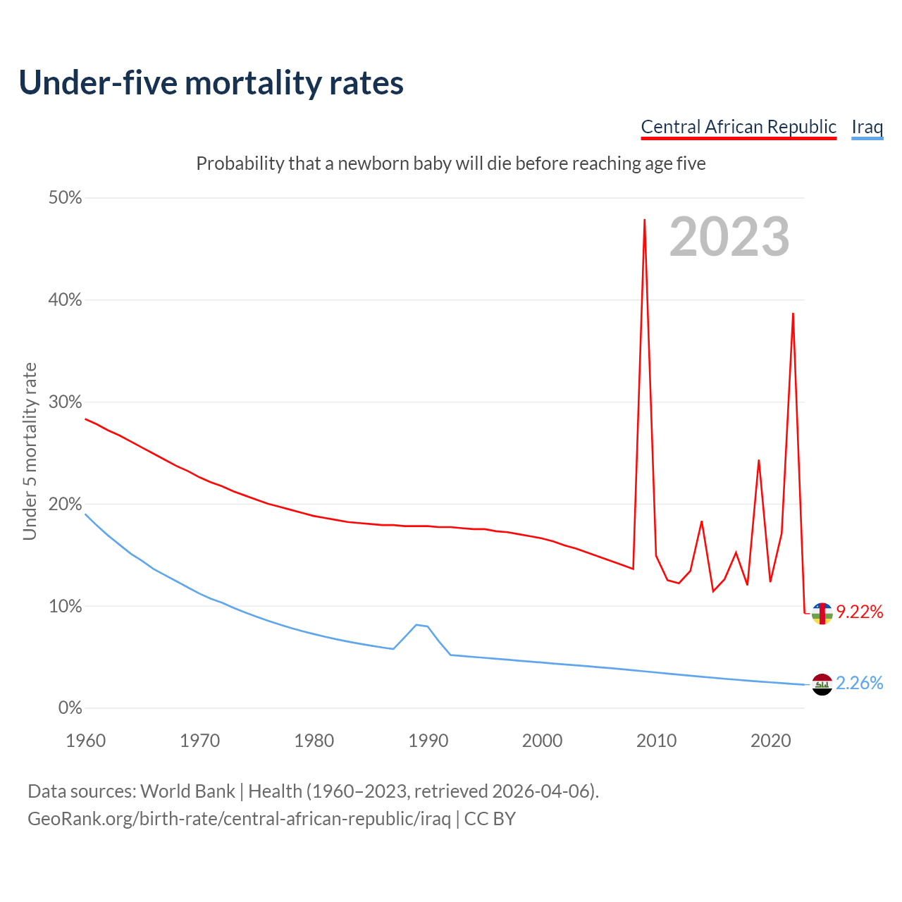 The chance that a newborn baby will die before reaching age five is 9.22% in the Central African Republic and 2.26% in Iraq. Above is a chart with historical data on under-five mortality rates.