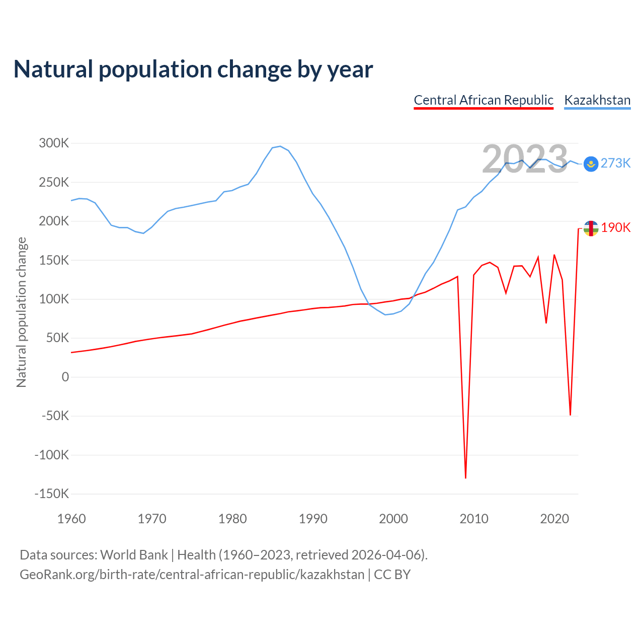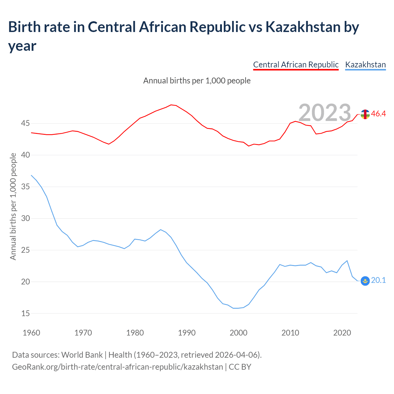 The Central African Republic has an annual birth rate of 46.4 births per 1,000 people, compared to 20.1 for Kazakhstan. The average number of children a woman is expected to have during her lifetime — the fertility rate, is 6.01 in the Central African Republic and 3.01 in Kazakhstan — 49.9% difference.