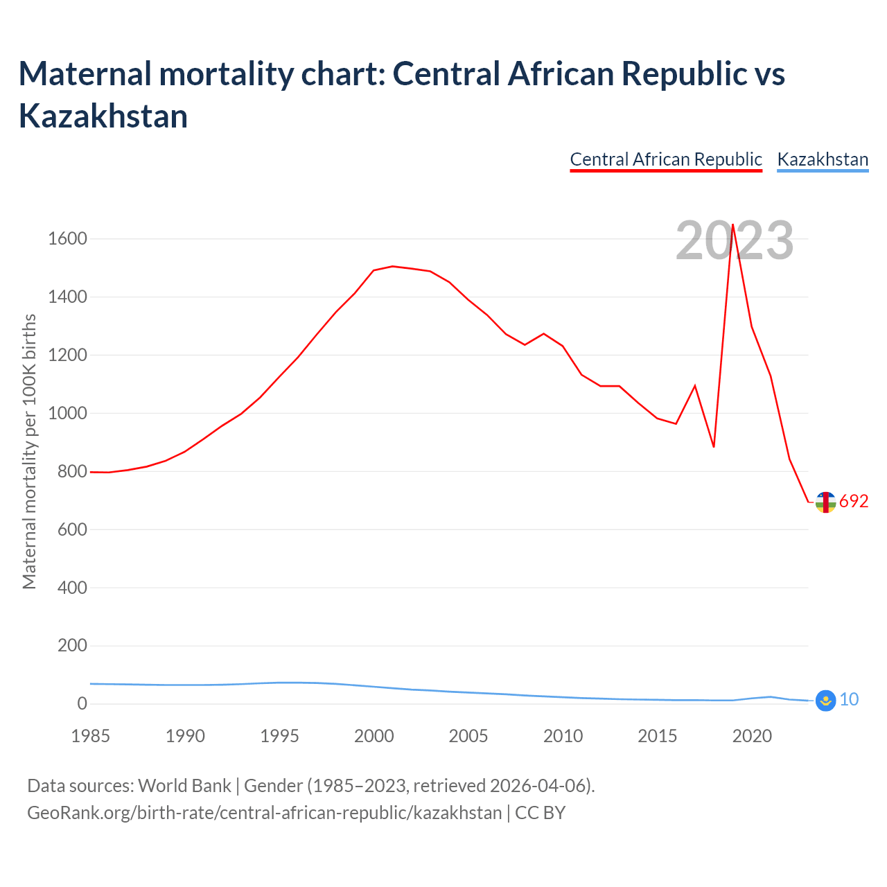 The maternal mortality rate, which is the probability of dying during childbirth or within 42 days of pregnancy termination, is 692 deaths per 100,000 live births in the Central African Republic, compared to 10 deaths in Kazakhstan.