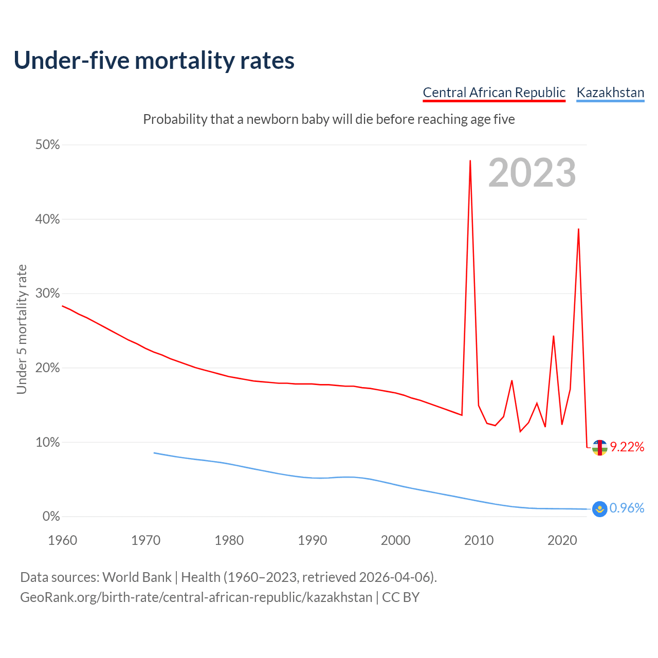 The chance that a newborn baby will die before reaching age five is 9.22% in the Central African Republic and 0.96% in Kazakhstan. Above is a chart with historical data on under-five mortality rates.