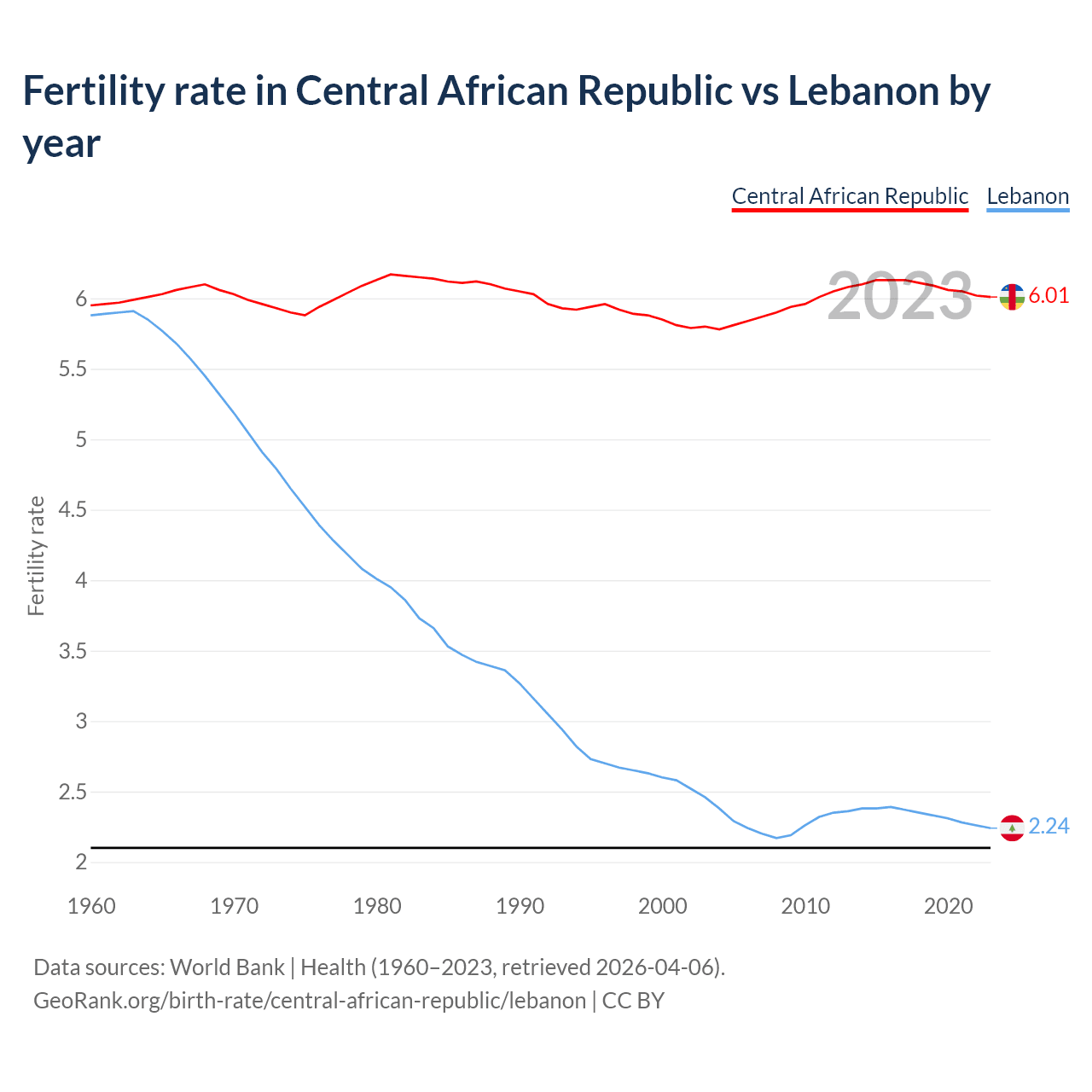 1960 vs 2023, the fertility rate has changed by +1.08% in the Central African Republic and by 61.9% in Lebanon — in 1960, it was 5.95 and 5.88, respectively.