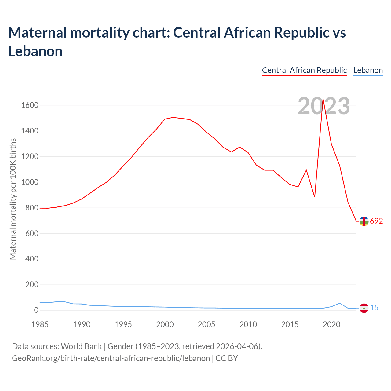The maternal mortality rate, which is the probability of dying during childbirth or within 42 days of pregnancy termination, is 692 deaths per 100,000 live births in the Central African Republic, compared to 15 deaths in Lebanon.