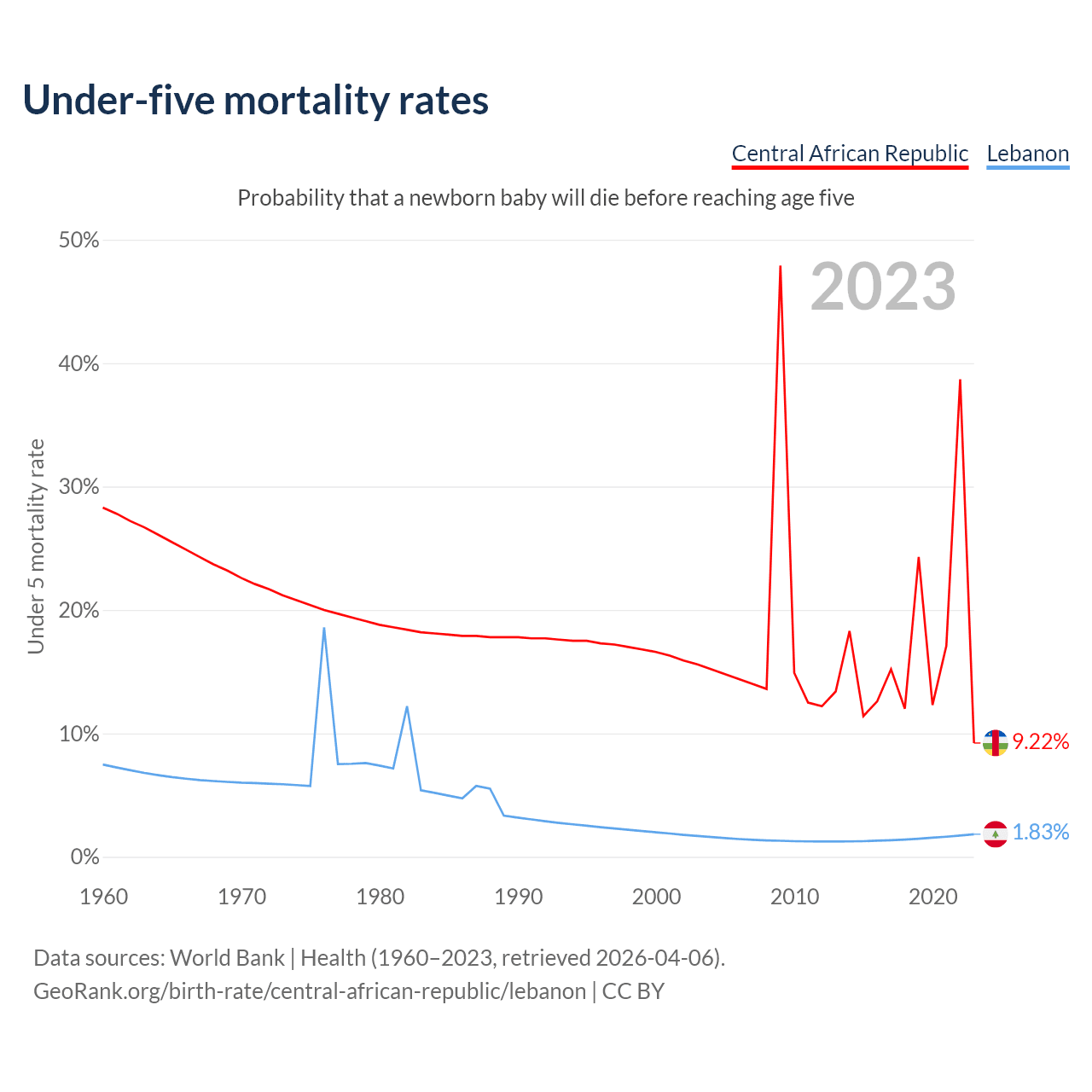 The chance that a newborn baby will die before reaching age five is 9.22% in the Central African Republic and 1.83% in Lebanon. Above is a chart with historical data on under-five mortality rates.