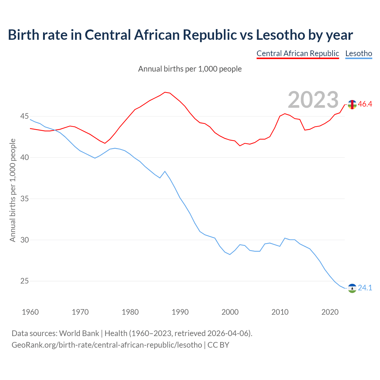 The Central African Republic has an annual birth rate of 46.4 births per 1,000 people, compared to 24.1 for Lesotho. The average number of children a woman is expected to have during her lifetime — the fertility rate, is 6.01 in the Central African Republic and 2.69 in Lesotho — 55.2% difference.