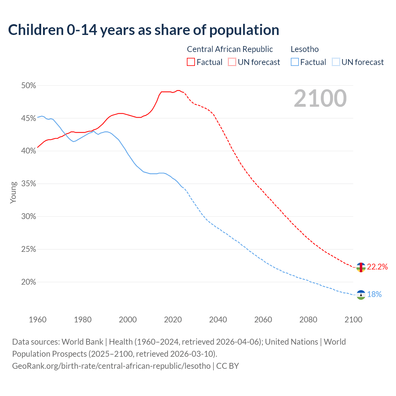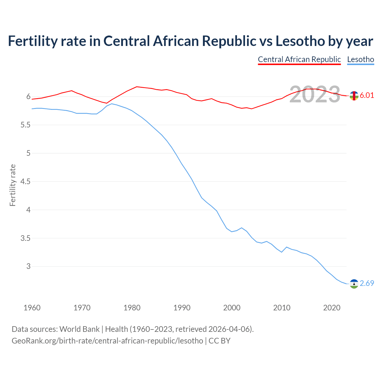 According to the latest available data on birth rates, the fertility rate in the Central African Republic was 6.01 children per woman in 2023, compared to 2.69 in Lesotho in 2023. The replacement level is considered to be 2.1 children per woman.
