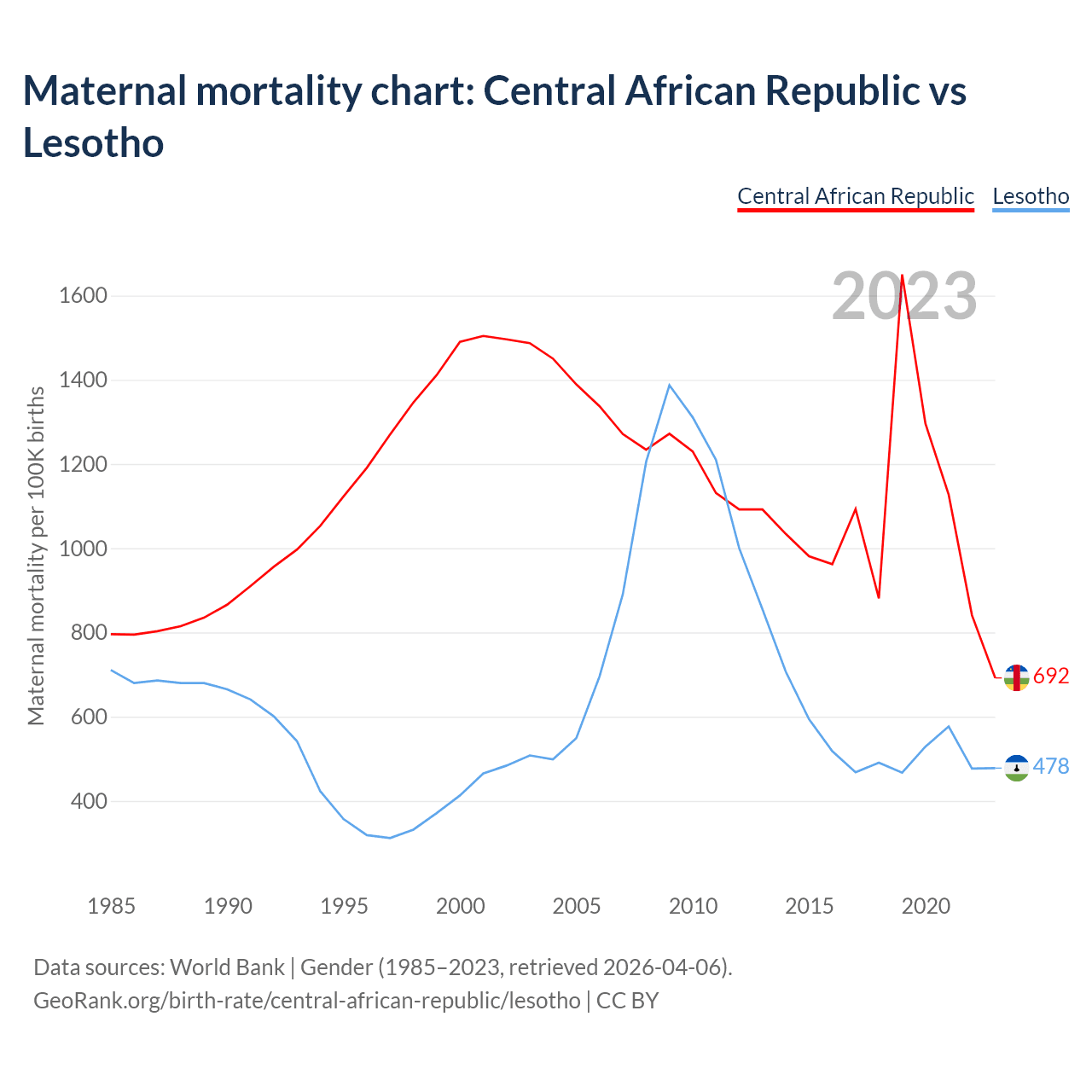 The maternal mortality rate, which is the probability of dying during childbirth or within 42 days of pregnancy termination, is 692 deaths per 100,000 live births in the Central African Republic, compared to 478 deaths in Lesotho.
