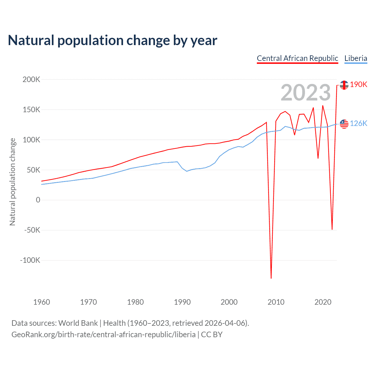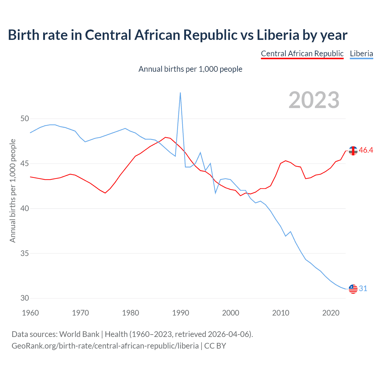 The Central African Republic has an annual birth rate of 46.4 births per 1,000 people, compared to 31 for Liberia. The average number of children a woman is expected to have during her lifetime — the fertility rate, is 6.01 in the Central African Republic and 3.95 in Liberia — 34.3% difference.