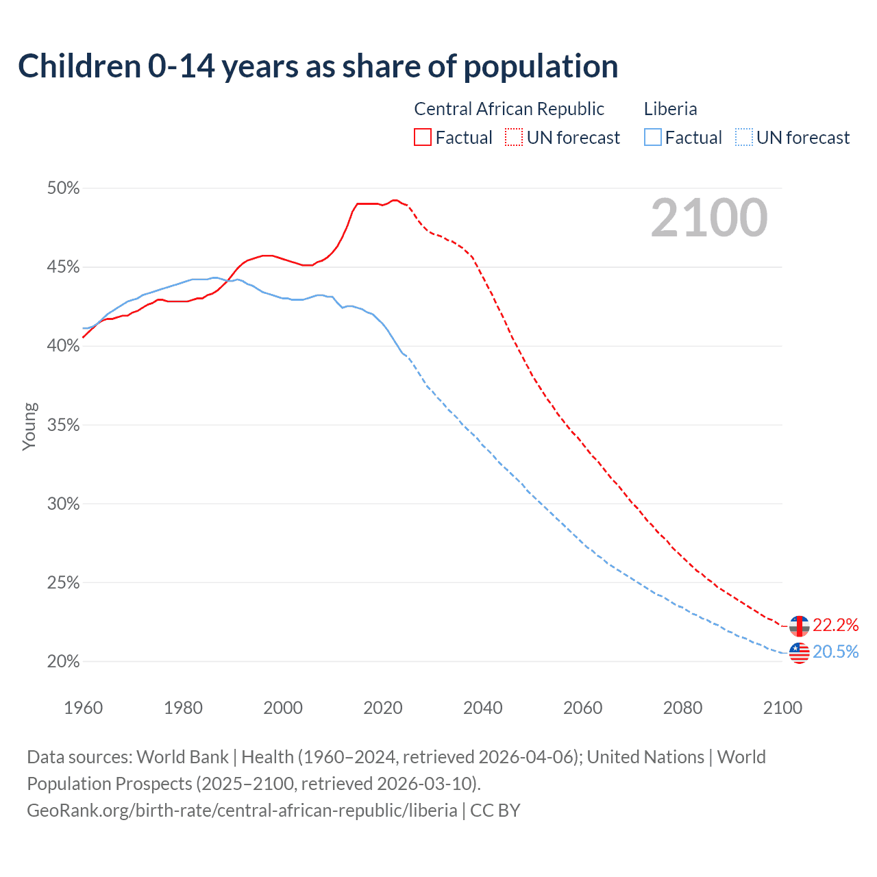 According to the latest available data on birth rates, the fertility rate in the Central African Republic was 6.01 children per woman in 2023, compared to 3.95 in Liberia in 2023. The replacement level is considered to be 2.1 children per woman.