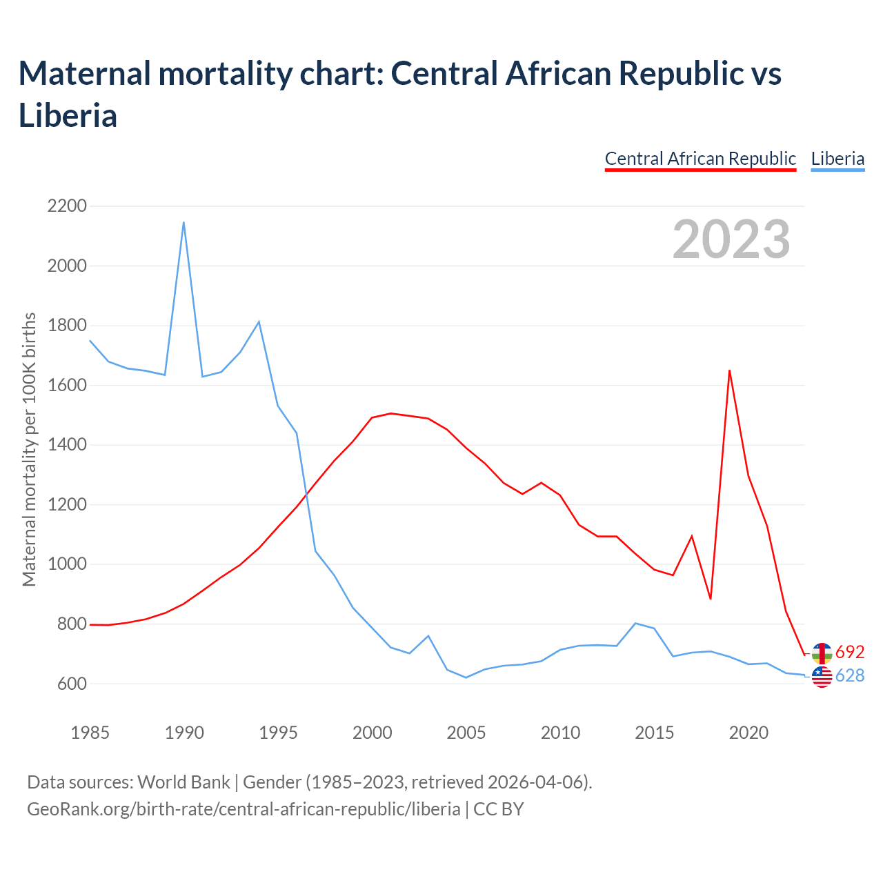 The maternal mortality rate, which is the probability of dying during childbirth or within 42 days of pregnancy termination, is 692 deaths per 100,000 live births in the Central African Republic, compared to 628 deaths in Liberia.