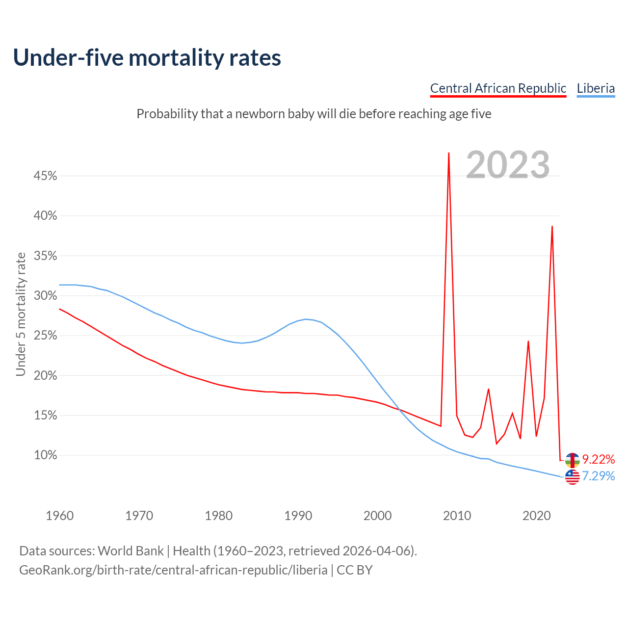 The chance that a newborn baby will die before reaching age five is 9.22% in the Central African Republic and 7.29% in Liberia. Above is a chart with historical data on under-five mortality rates.