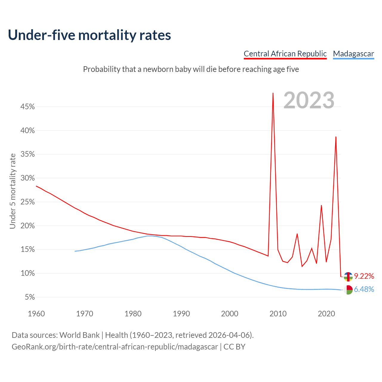 The chance that a newborn baby will die before reaching age five is 9.22% in the Central African Republic and 6.48% in Madagascar. Above is a chart with historical data on under-five mortality rates.