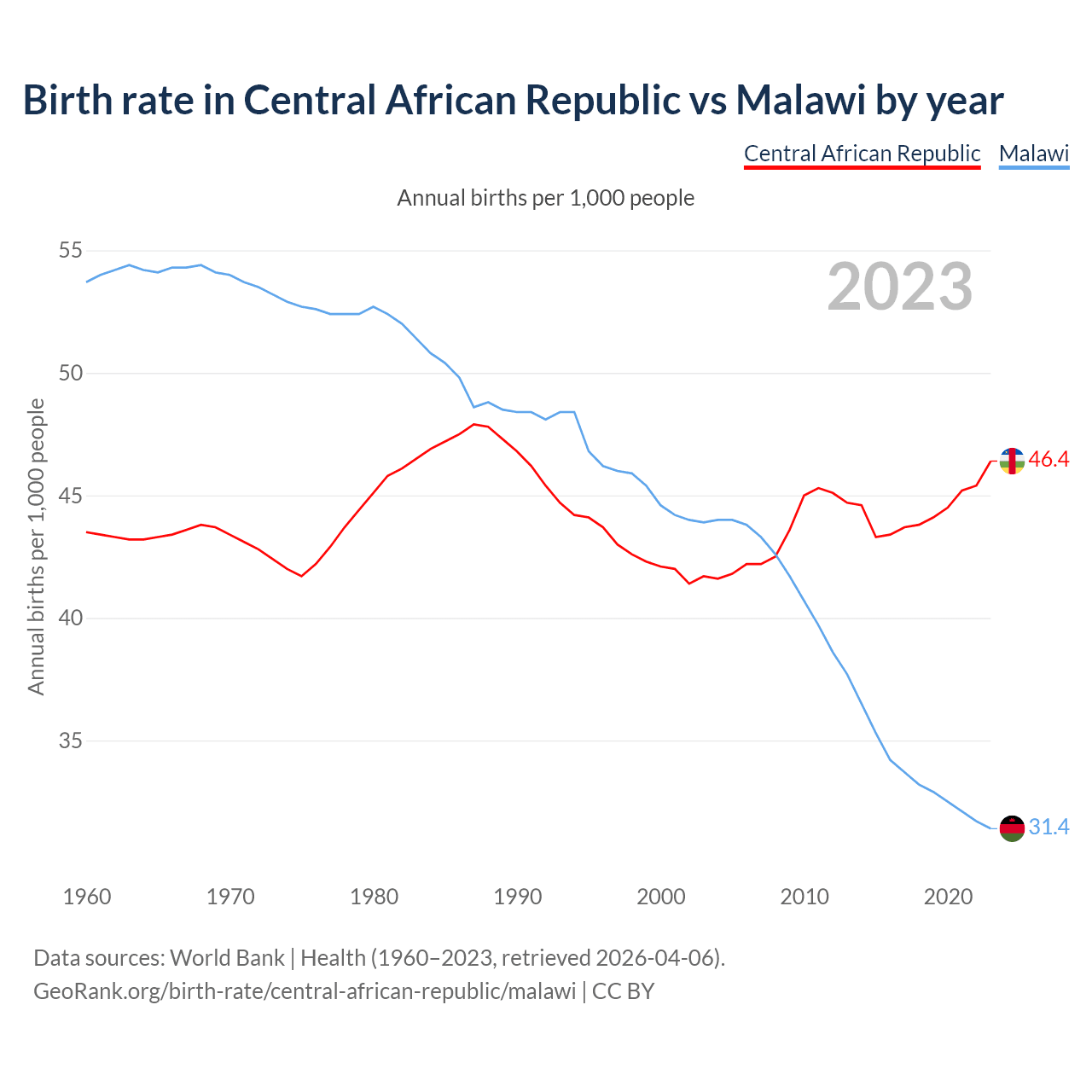 The Central African Republic has an annual birth rate of 46.4 births per 1,000 people, compared to 31.4 for Malawi. The average number of children a woman is expected to have during her lifetime — the fertility rate, is 6.01 in the Central African Republic and 3.65 in Malawi — 39.3% difference.
