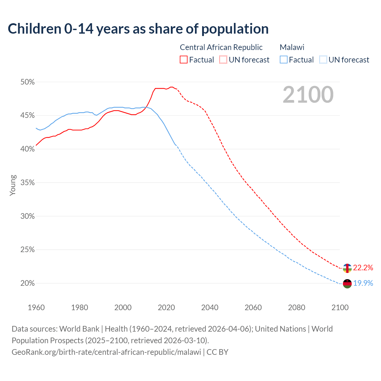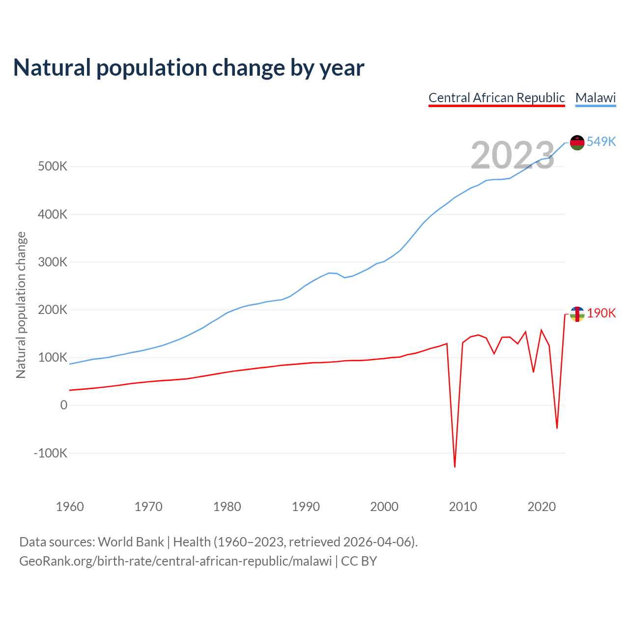 According to the latest available data on birth rates, the fertility rate in the Central African Republic was 6.01 children per woman in 2023, compared to 3.65 in Malawi in 2023. The replacement level is considered to be 2.1 children per woman.