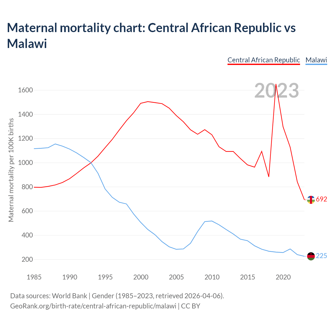 The maternal mortality rate, which is the probability of dying during childbirth or within 42 days of pregnancy termination, is 692 deaths per 100,000 live births in the Central African Republic, compared to 225 deaths in Malawi.