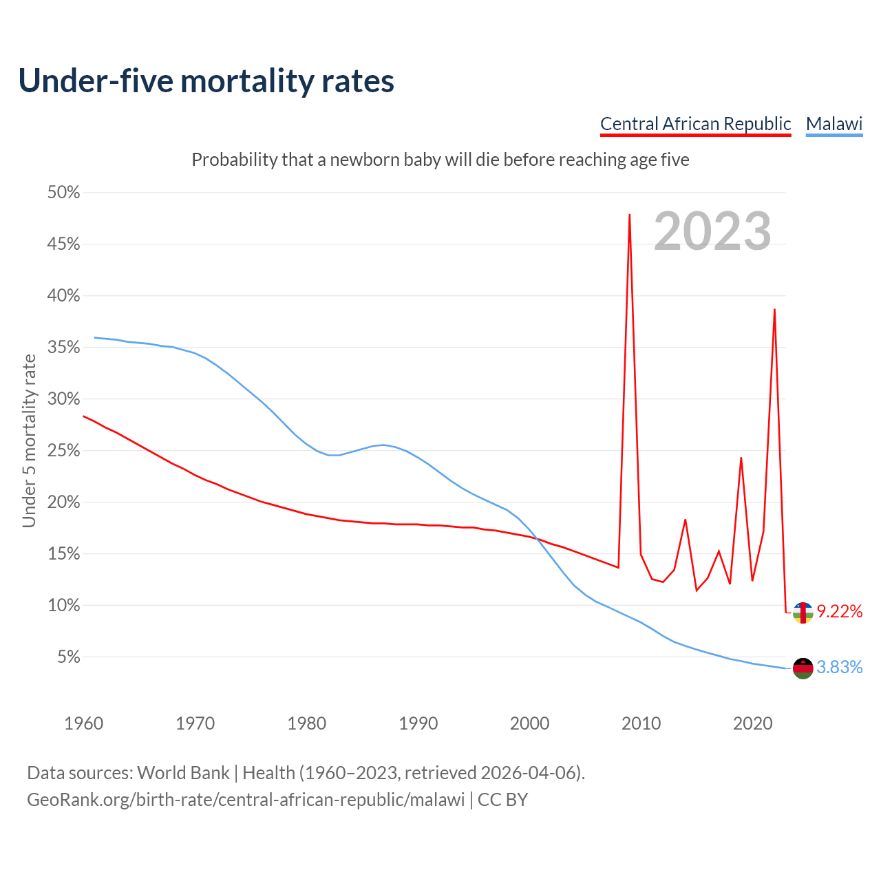 The chance that a newborn baby will die before reaching age five is 9.22% in the Central African Republic and 3.83% in Malawi. Above is a chart with historical data on under-five mortality rates.