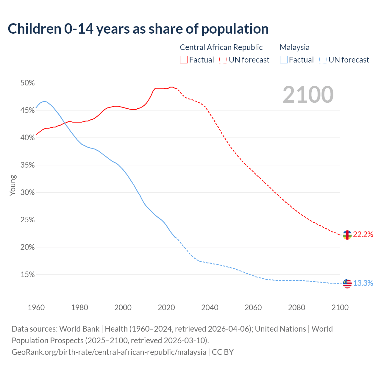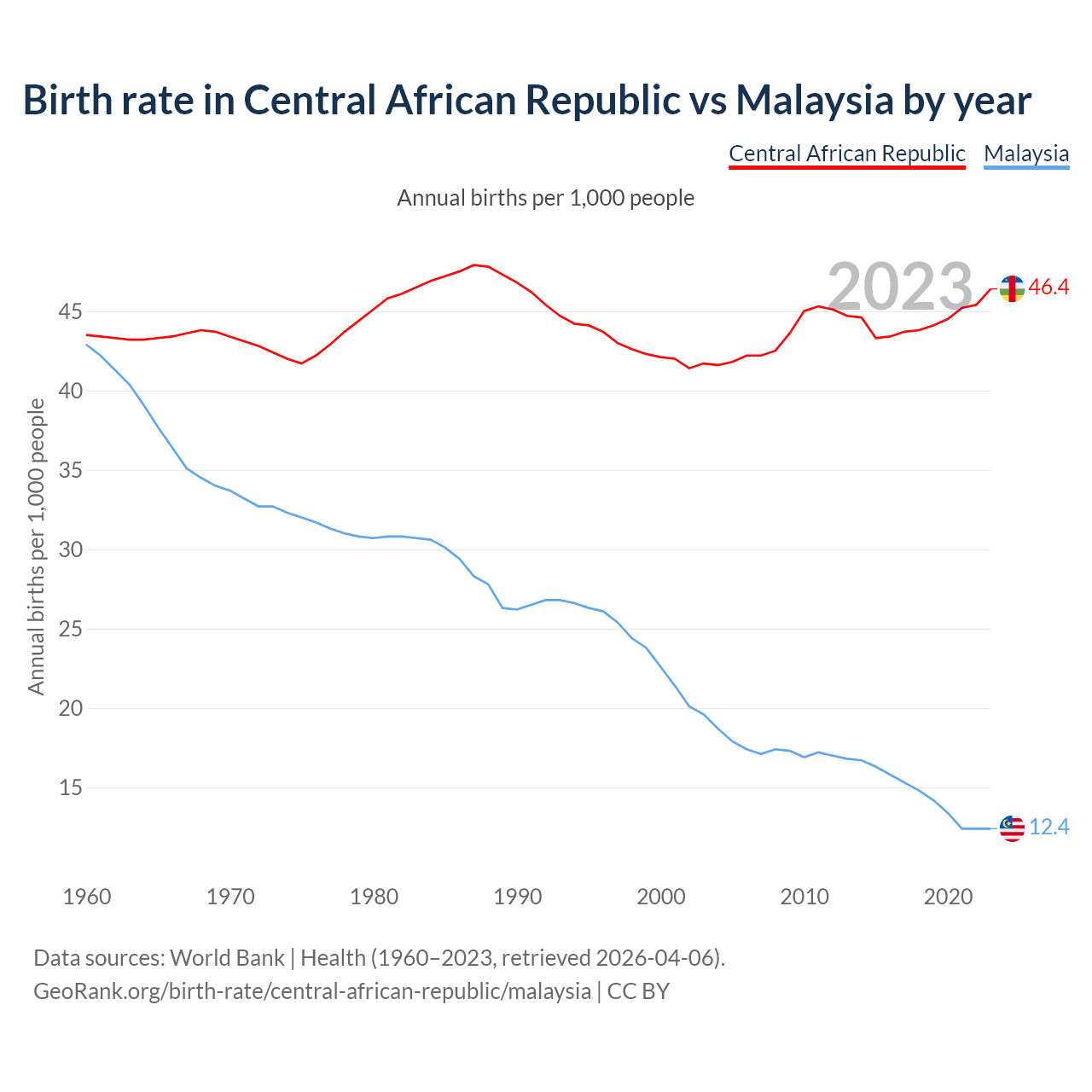 The Central African Republic has an annual birth rate of 46.4 births per 1,000 people, compared to 12.4 for Malaysia. The average number of children a woman is expected to have during her lifetime — the fertility rate, is 6.01 in the Central African Republic and 1.55 in Malaysia — 74.2% difference.
