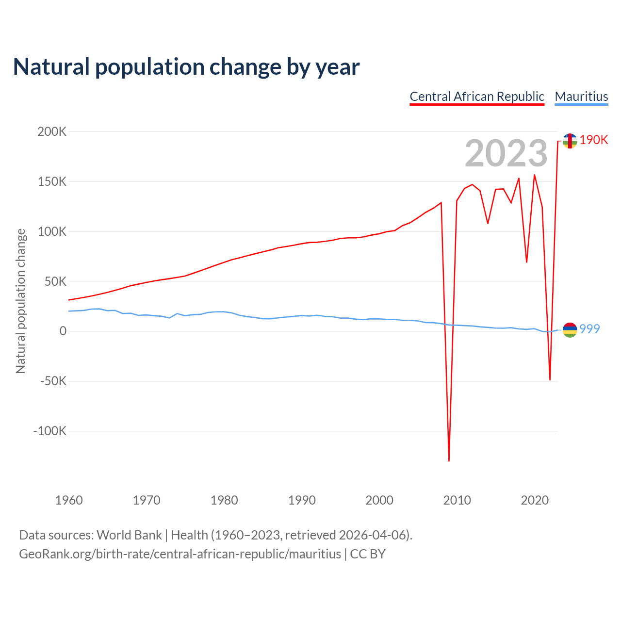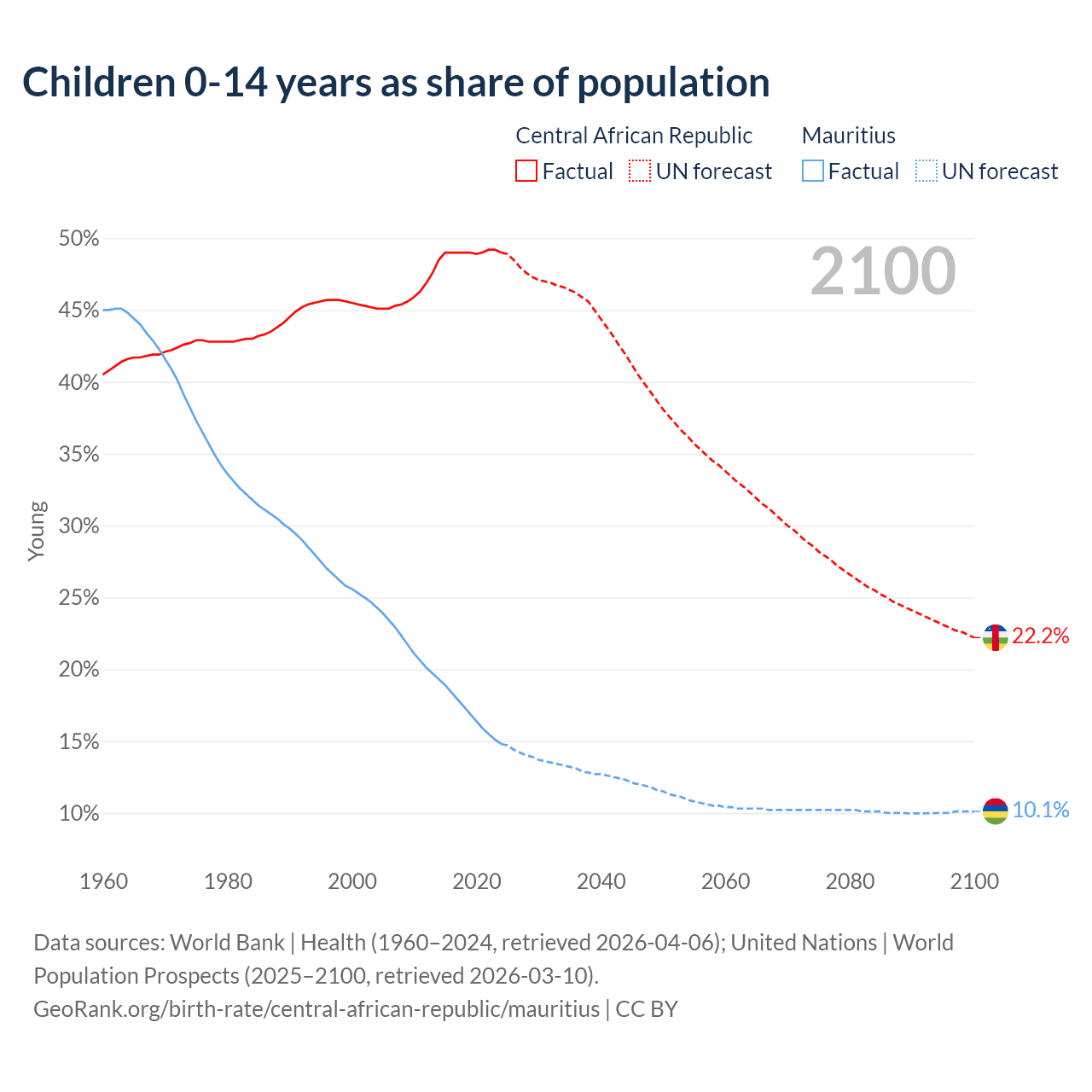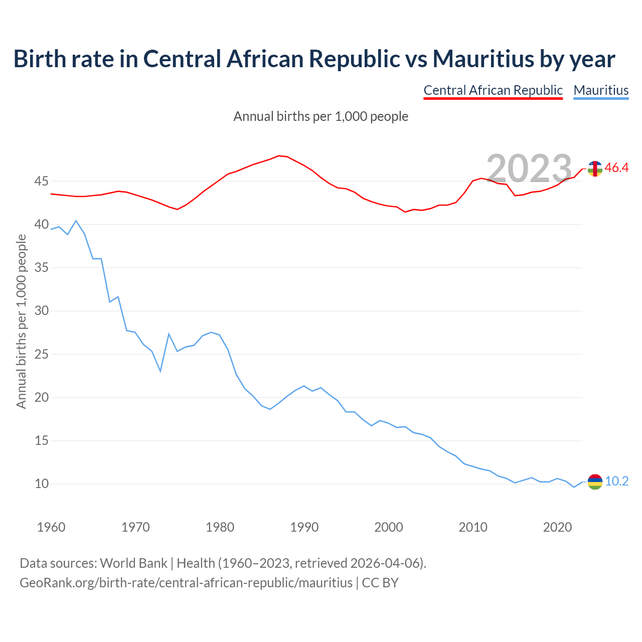 The Central African Republic has an annual birth rate of 46.4 births per 1,000 people, compared to 10.2 for Mauritius. The average number of children a woman is expected to have during her lifetime — the fertility rate, is 6.01 in the Central African Republic and 1.39 in Mauritius — 76.9% difference.