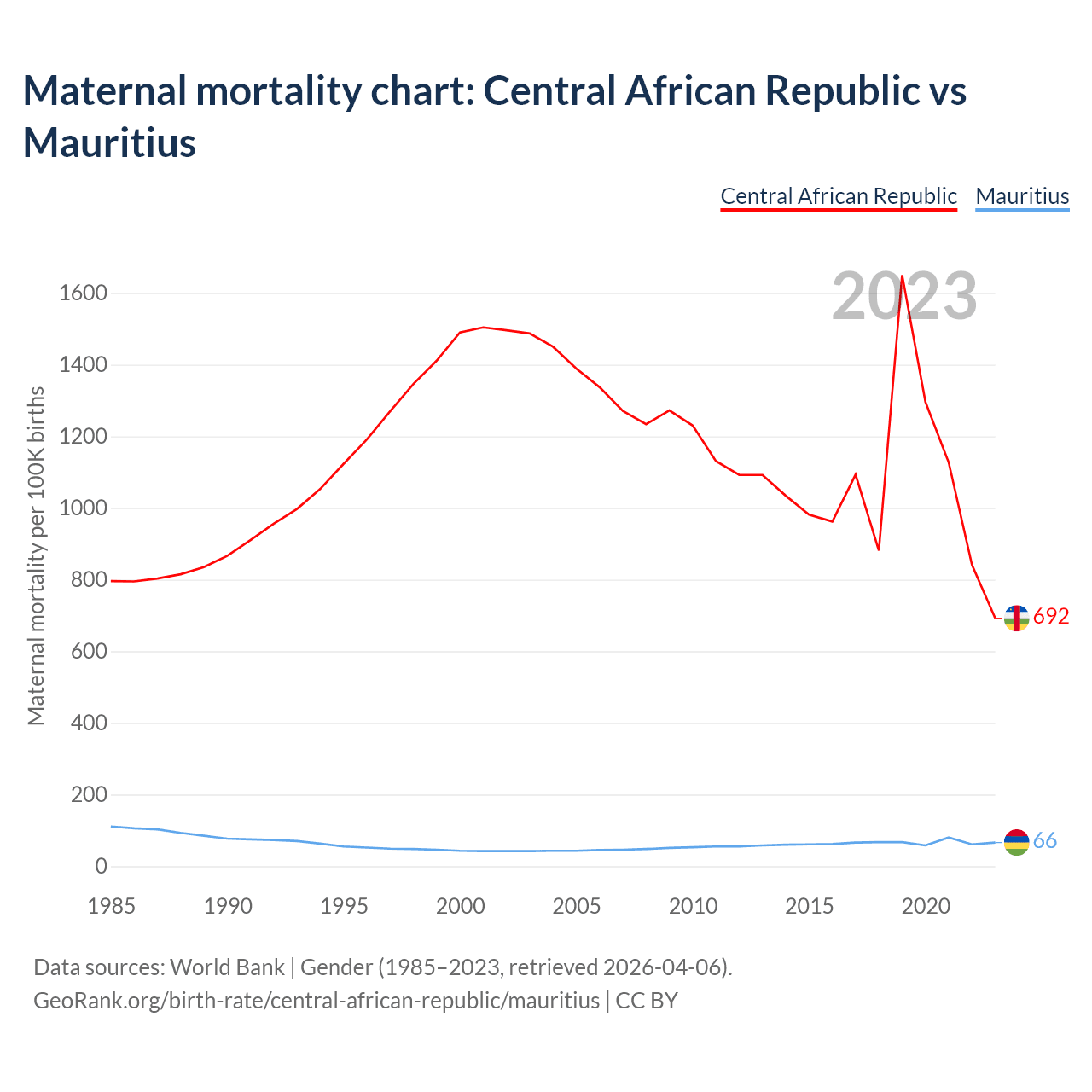 The maternal mortality rate, which is the probability of dying during childbirth or within 42 days of pregnancy termination, is 692 deaths per 100,000 live births in the Central African Republic, compared to 66 deaths in Mauritius.