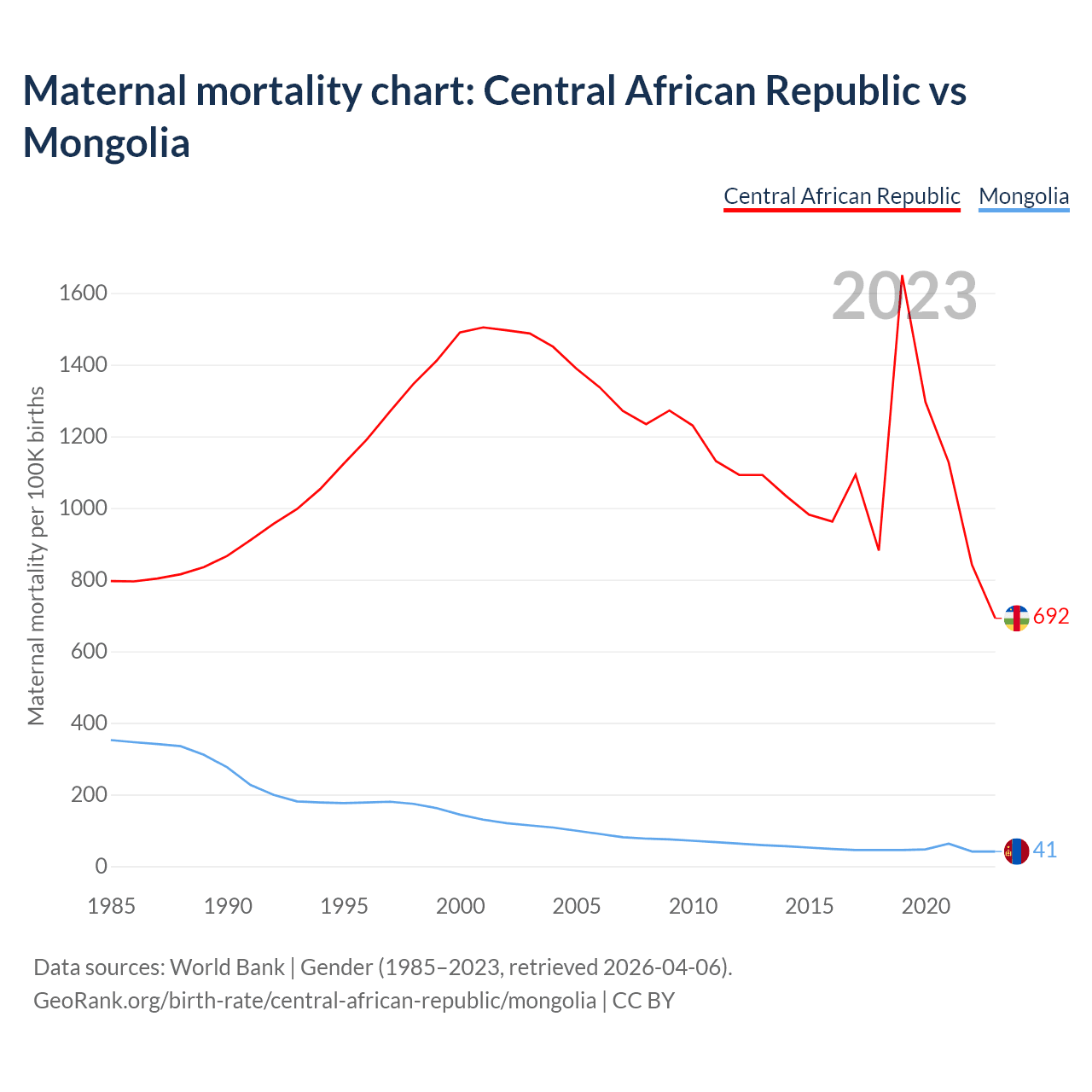 The maternal mortality rate, which is the probability of dying during childbirth or within 42 days of pregnancy termination, is 692 deaths per 100,000 live births in the Central African Republic, compared to 41 deaths in Mongolia.