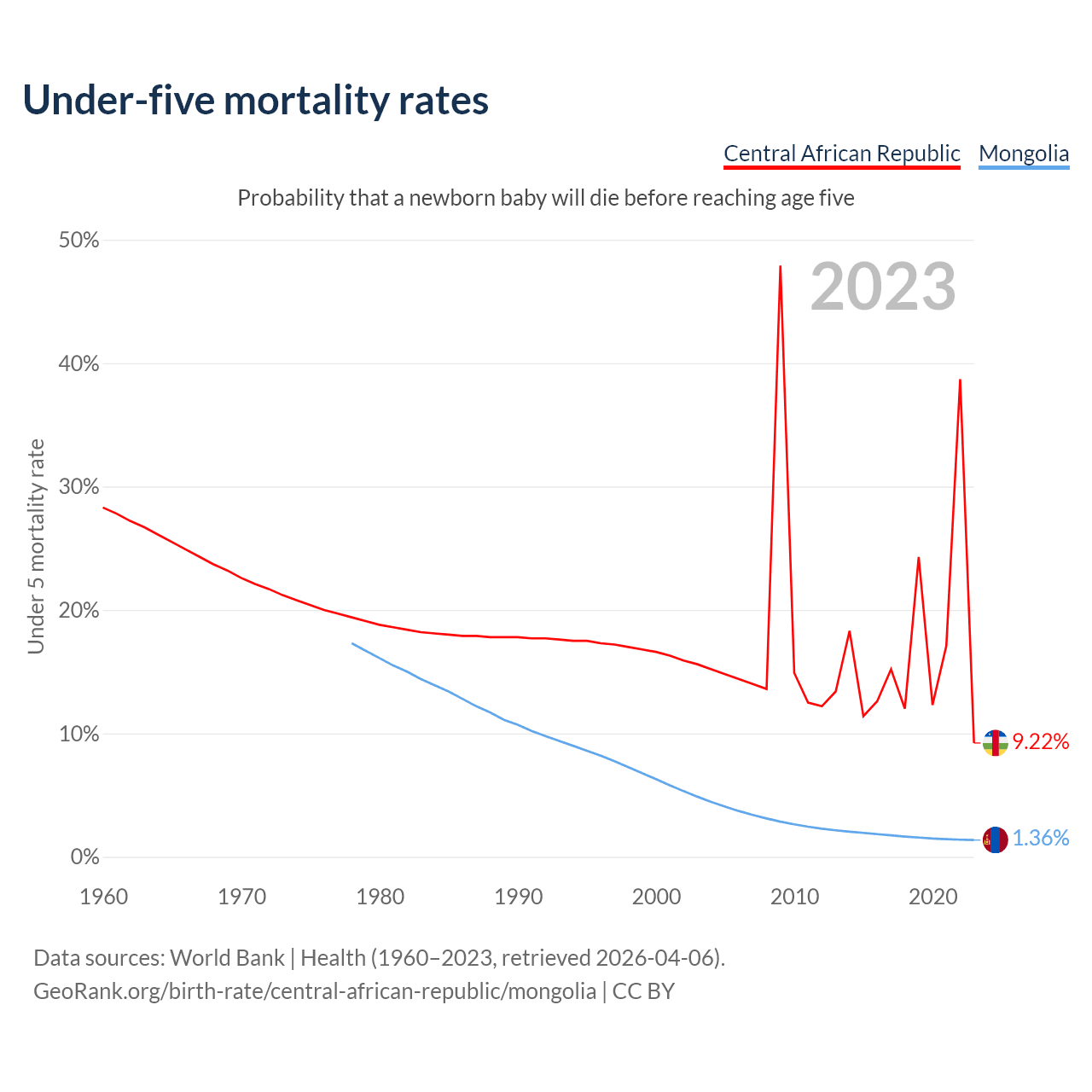 The chance that a newborn baby will die before reaching age five is 9.22% in the Central African Republic and 1.36% in Mongolia. Above is a chart with historical data on under-five mortality rates.