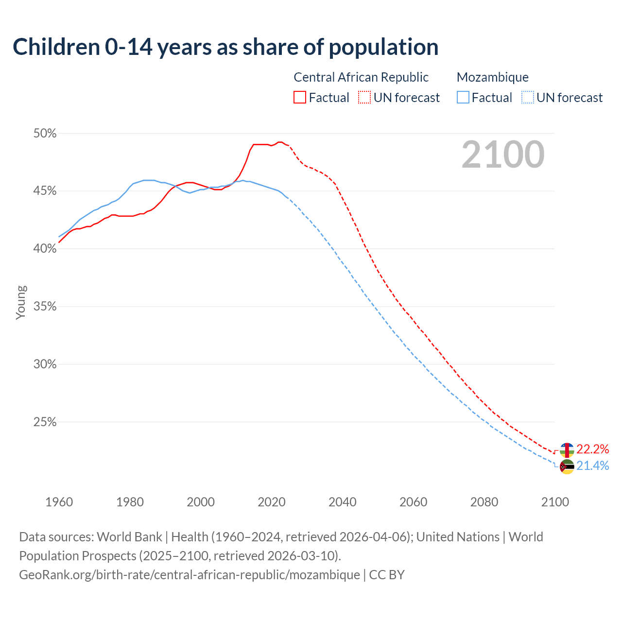 According to the latest available data on birth rates, the fertility rate in the Central African Republic was 6.01 children per woman in 2023, compared to 4.76 in Mozambique in 2023. The replacement level is considered to be 2.1 children per woman.