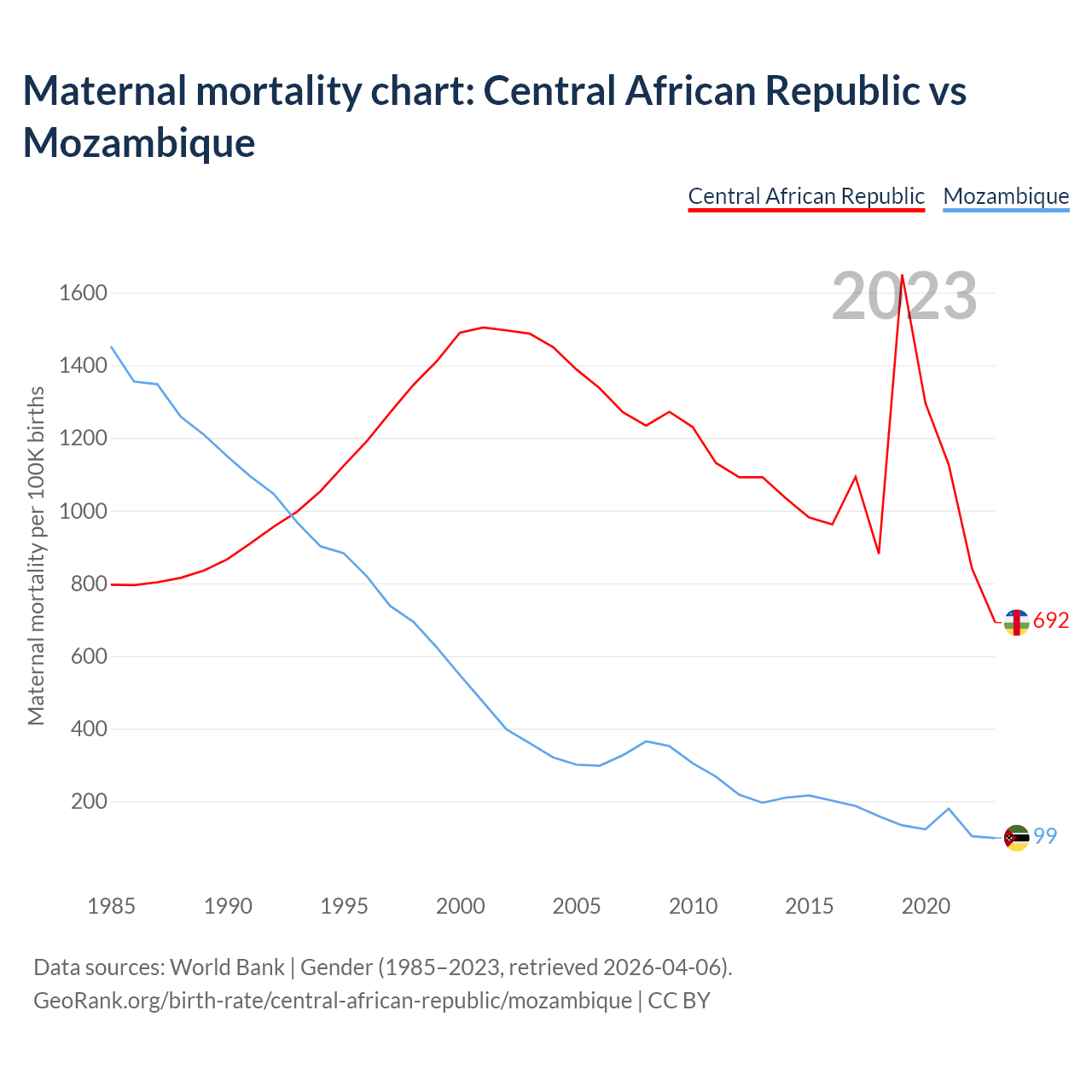 The maternal mortality rate, which is the probability of dying during childbirth or within 42 days of pregnancy termination, is 692 deaths per 100,000 live births in the Central African Republic, compared to 99 deaths in Mozambique.