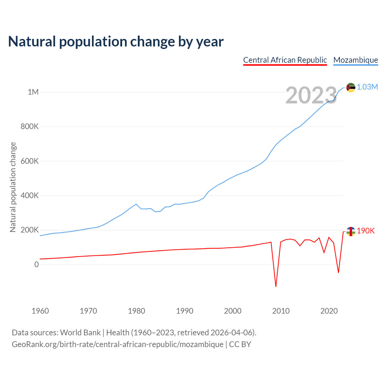 The Central African Republic has an annual birth rate of 46.4 births per 1,000 people, compared to 37.5 for Mozambique. The average number of children a woman is expected to have during her lifetime — the fertility rate, is 6.01 in the Central African Republic and 4.76 in Mozambique — 20.8% difference.